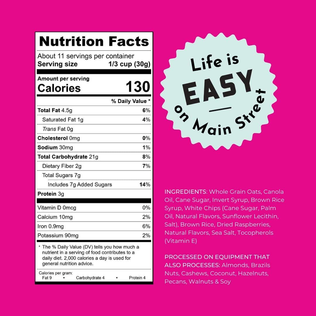 Q: What are the main ingredients in the White Chip Raspberry Swirl Granola?A: The main ingredients include gluten-free oats, white chocolate chips, and real raspberries, creating a delicious and nutritious granola option.