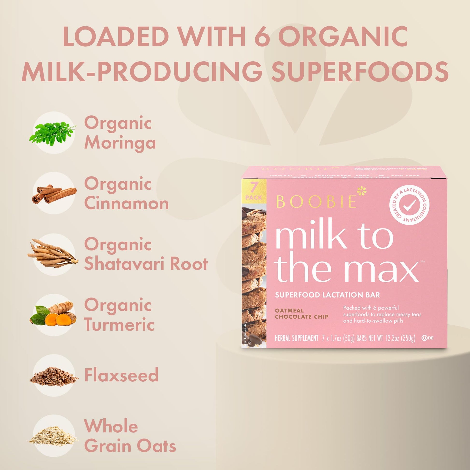 Q: What are the key ingredients in Boobie Bar Lactation Bars?A: Boobie Bar Lactation Bars are made with powerful superfoods including Moringa, Turmeric, Cinnamon, Shatavari, Flaxseed, and Whole Grain Oats, all carefully selected to help boost milk supply for breastfeeding moms.