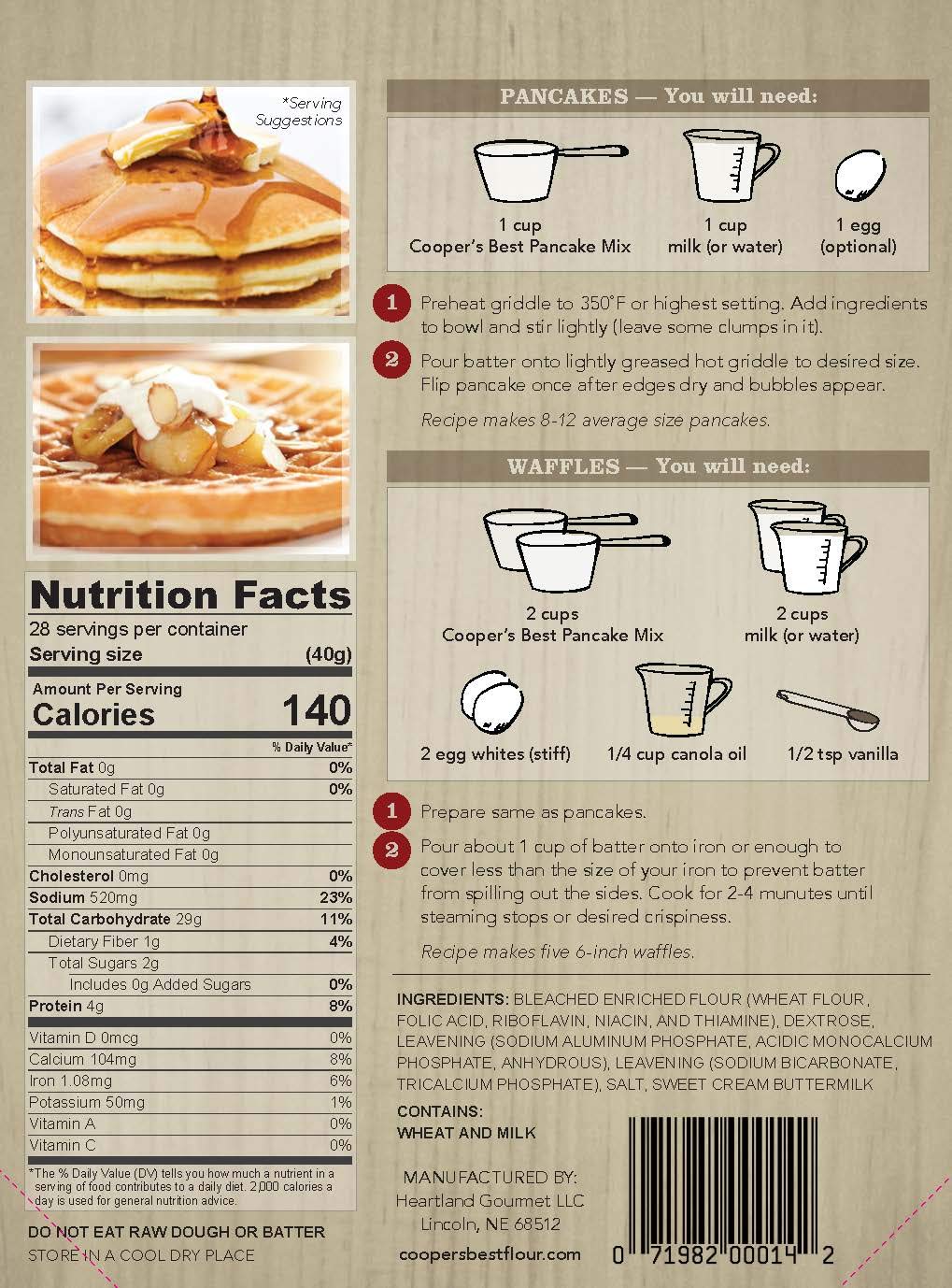 At Coopers Best, Weve Been Providing Premium Milled Flour And Mixes For Waffles, Pancakes, Biscuits And More Since 1876. We Strive For The Highest Of Quality In Everything We Make Because Breakfast Is The Most Important Meal Of The Day (And We Say Should Be Served All Day!). Coopers Best Buttermilk Pancake And Waffle Mix Sometimes Theres Just Nothing Better Than An Old Classic! This 2.5 Lb Buttermilk Pancake And Waffle Mix Brings A Bag Full Of The Stuff Your Grandma Used To Make Straight To Your Familys Table. Based On The Original Coppers Mix Made In The 1970S In Nebraska, This Popular Mix Has Been Perfected Since The Moment Coopers Best Started Providing Premium Milled Flour And Mixes To Families All Across The United States In 1876. A Little Goes A Long Way The Perfect Size For The Whole Family, One Bag Gives You Up To 28 Servings And Just Of This Mix Can Make 2-3 Pancakes, So Theres Plenty To Go Around! Make Them Sweet Or Savory With A Buttery Base, You Really Cant Go Wrong! We Recommend Adding Fun Flavors To The Mix, Depending On Which Craving Youre Satisfying. Here Are A Few Ideas: For Your Sweet Tooth: Try Mashed Banana, Strawberries, Blueberries, Or Chocolate Chips. For A Savory Craving: Try Spices, Cheese, Crumbled Bacon, Or Herbs Like Rosemary Or Sage. 100% Satisfaction Guarantee With A Long-Standing Tradition And A Proud History Of Made In The Us Products, We Stand By Their Quality, So If Youre Unsatisfied, Contact Us. We Will Fully Refund You Within 30 Days Of Purchase.