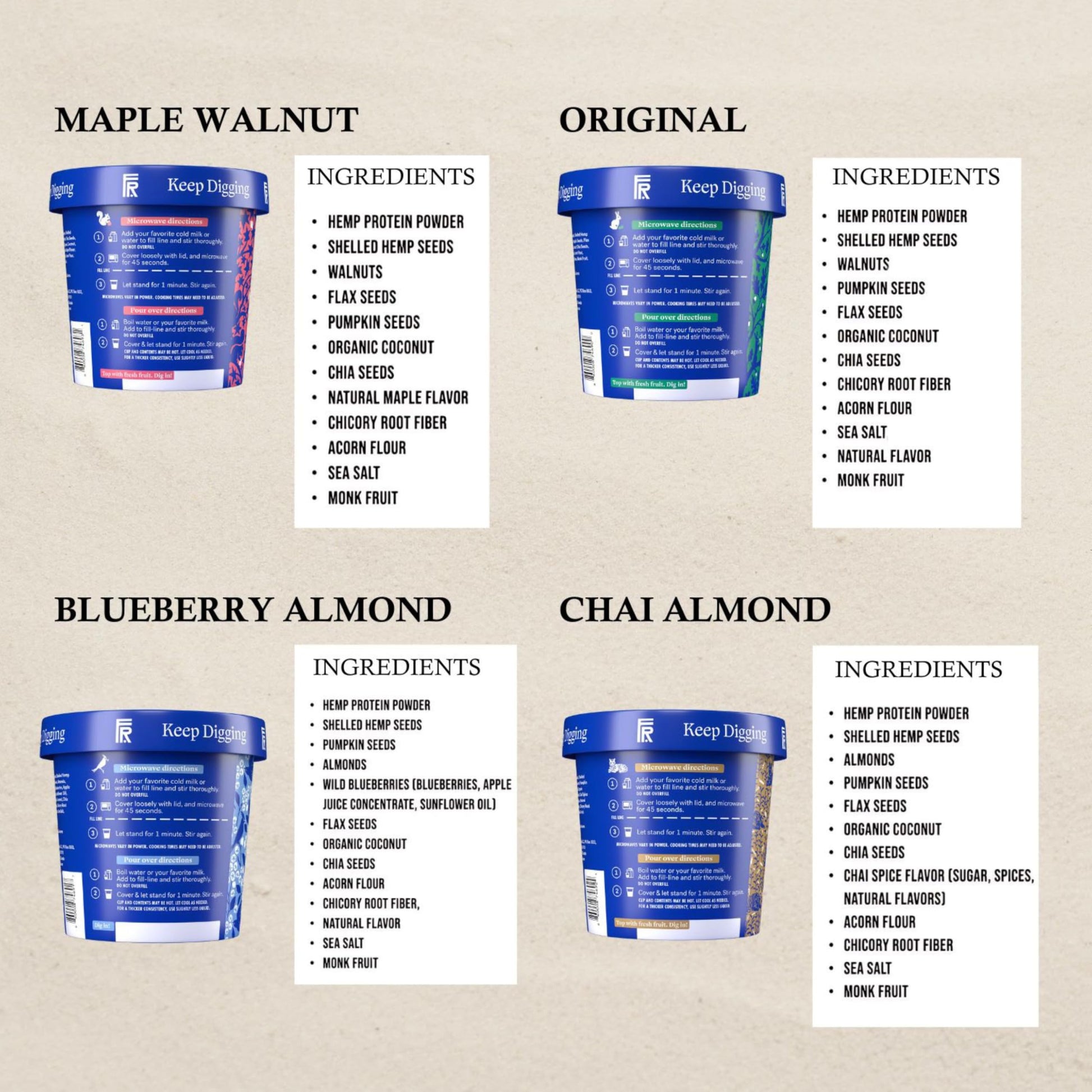 • Q: What ingredients are used in the various flavors of Folk Revival Keto Instant Oatmeal? A: Folk Revival Keto Instant Oatmeal is made from wholesome ingredients. The Original flavor contains hemp protein powder, acorn flour, and seeds, while the Blueberry Almond includes wild blueberries, and the Chai Almond features chai spice flavor. All flavors are crafted with natural ingredients to provide essential nutrition.