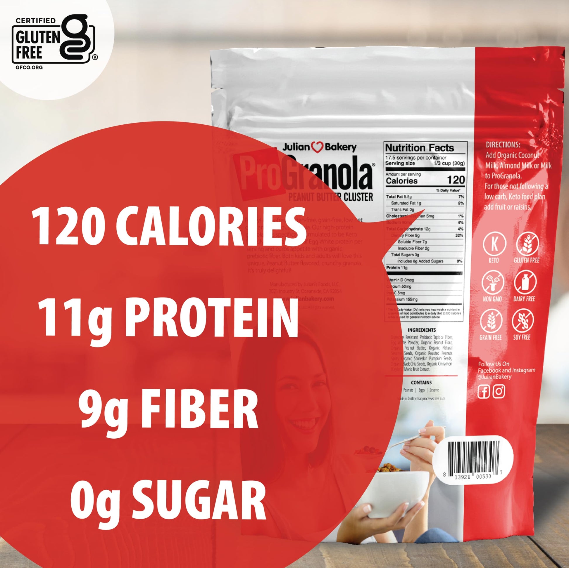 Q: What are the main ingredients in Julian Bakery ProGranola Cereal?A: Julian Bakery ProGranola Cereal features organic peanuts and peanut butter as primary ingredients, providing a delicious nutty flavor combined with sweetness.