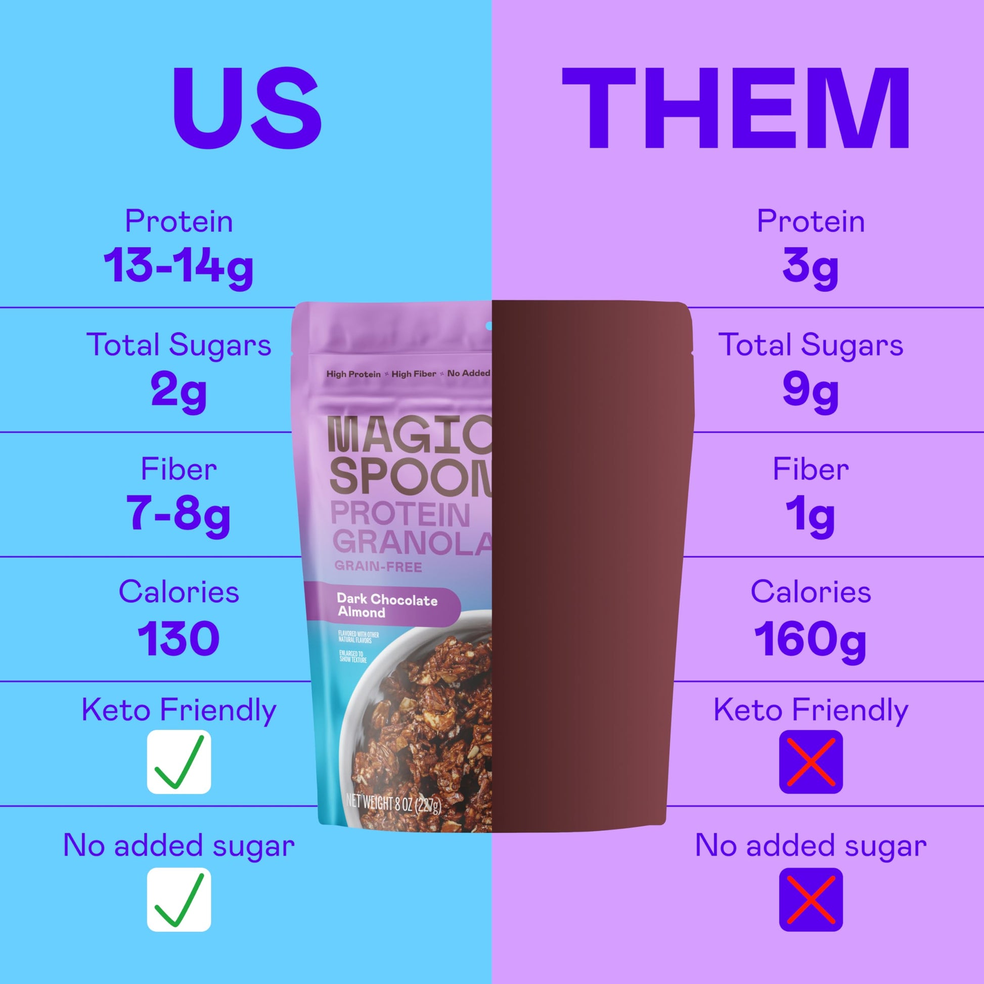 • Q: What flavors are available in the Magic Spoon Protein Granola packaging? A: The Magic Spoon Protein Granola comes in a 3-pack featuring the Dark Chocolate Almond flavor, which combines the richness of dark chocolate with the nuttiness of almonds for a delicious and satisfying snack.