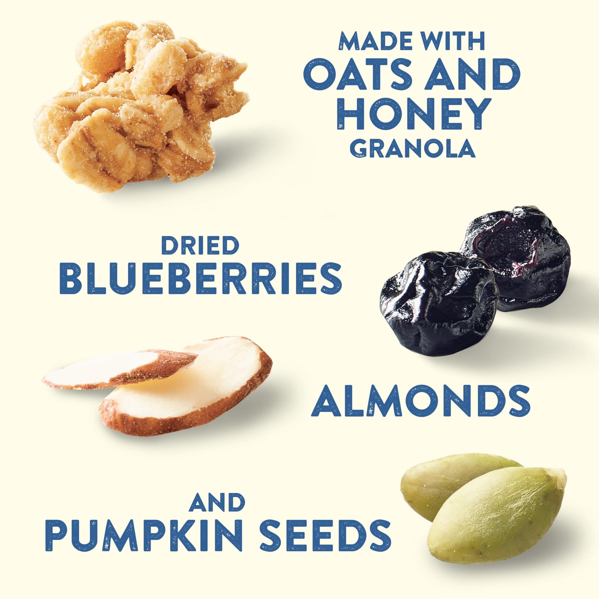- Q: What are the main ingredients in Nature Valley Honey Blueberry Yogurt Toppers? A: Nature Valley Honey Blueberry Yogurt Toppers are made with a delicious blend of oats and honey granola, dried blueberries, almonds, and pumpkin seeds. This combination provides a unique mix of flavors and textures that enhance your yogurt experience.