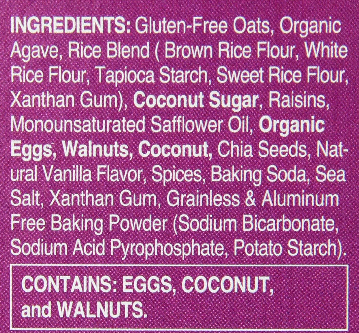 Save on Pamela's Oat Raisin Walnut Spice Bars . These cinnamon filled, tasty snack bars are delicious and offer whole grains, antioxidants and are gluten-free. Made with gluten-free oats, chia seeds and lightly sweetened with agave and coconut sugar, Pamelas Oat Raisin Walnut Spice Whenever Bars offer a satisfying snack whenever the desire strikes. (Description is informational only. Please refer to the actual manufacturer's product label prior to use. Please address any health concerns to your health professional prior to use.)