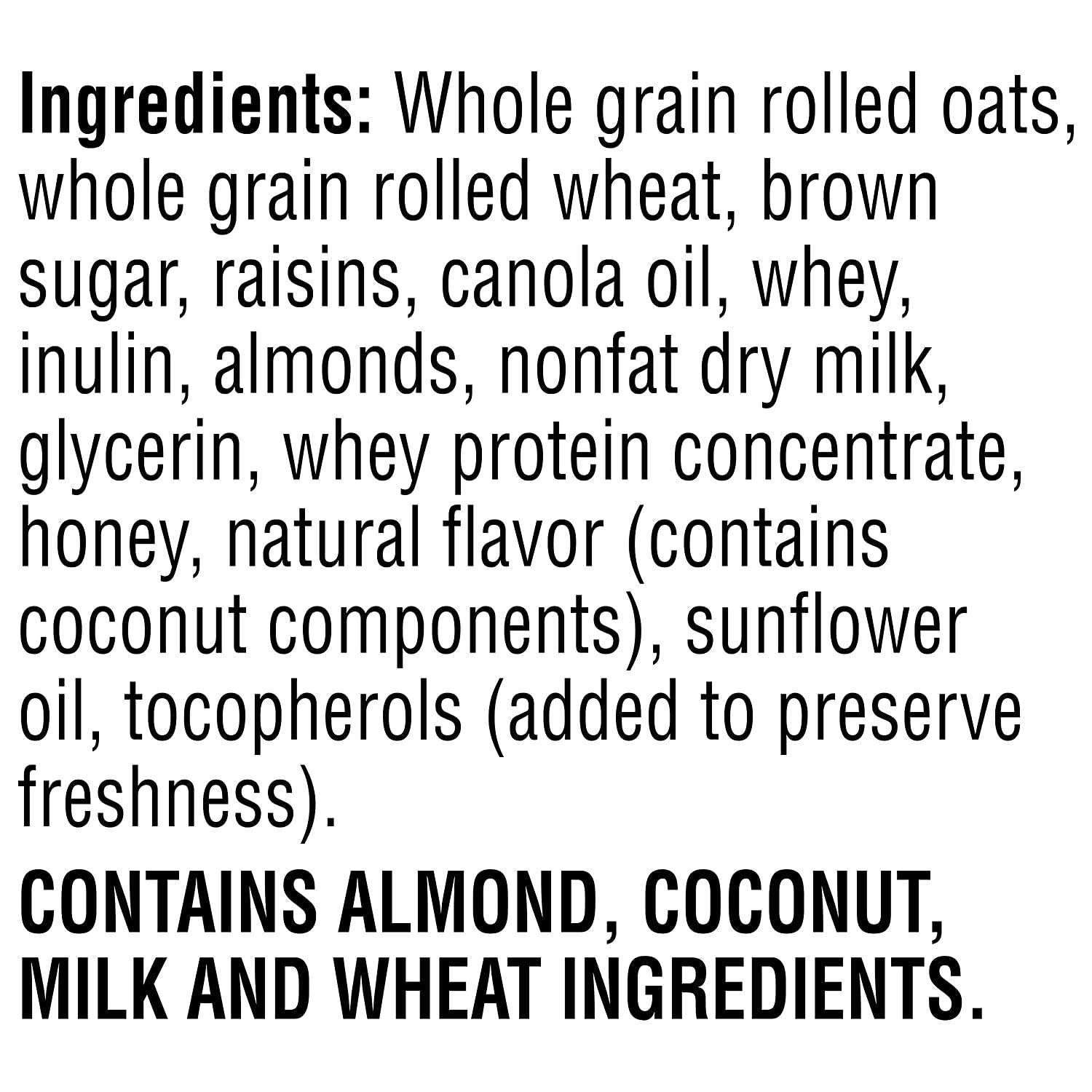 Q: What ingredients are in Quaker Natural Granola?A: Quaker Natural Granola is made with wholesome ingredients including oats, honey, raisins, and almonds, providing a delicious and nutritious snack option.