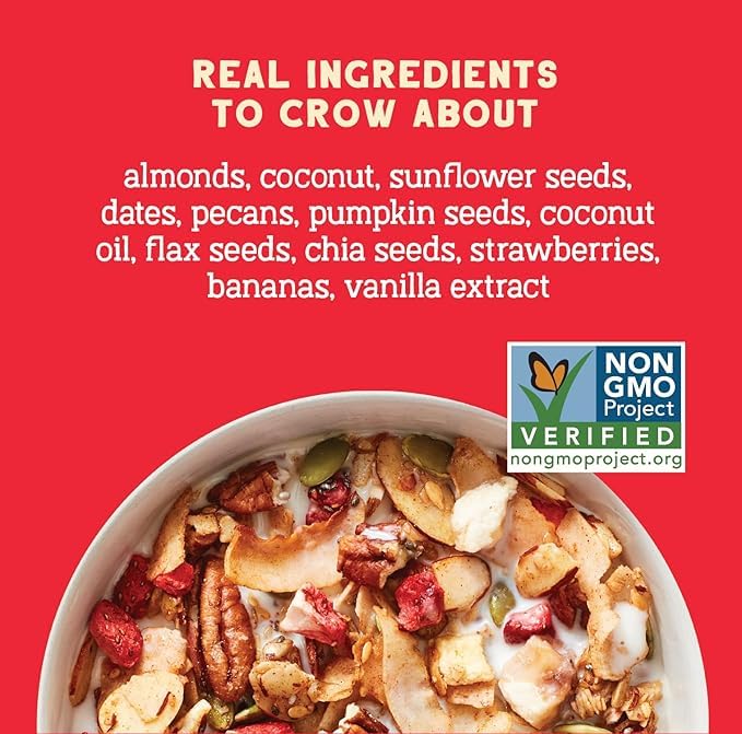 Keep It Real: Our Rise & Shine Grain Free Nut Granola Is A Crunchy-Chewy Blend Of Real Ingredients Like Strawberries, Bananas, Dates And Coconut, Almonds And Pecans, And Sunflower, Pumpkin, Chia And Flax Seeds No Weird Stuff Ever: Our Certified Gluten Free Granola Is Also Vegan And Non Gmo With No Artificial Flavors. With Zero Sugar, 5G Of Plant Protein And 5G Net Carbs, Our Nut Granola Is A Perfect Paleo And Keto Option Subtly Sweetened By Nature: Our Nut Granola Has The Perfect Touch Of Sweetness From Natural Sweeteners Like Dates. We Left Out The Sweeteners Like Stevia And Erythritol So You Can Feel Great About What'S In Your Bowl Think Outside The Box: Rise & Shine Is Delicious Any Time With A Splash Of Your Favorite Milk, As A Topping For Oatmeal, Smoothie Bowls Or Yogurt, Or Right Out Of The Bag For A Perfect On-The-Go Snack Because We Give A Cluck: We Make Obsessively Clean, Real Delicious Cereals That Are Good For You And Better For The Planet. Explore Our Family Of Cereals Including Our Mueslis, Nut Granolas, Sunflower Cereals, Protein Oats And Oat Protein Cereals (Pack Of 2) -Sundays Nut Granola Cereal, Rise & Shine Strawberry Banana Nut, 20 Oz Bag, Grain & Gluten Free, 5G Protein, 5G Net Carbs, Keto Friendly
