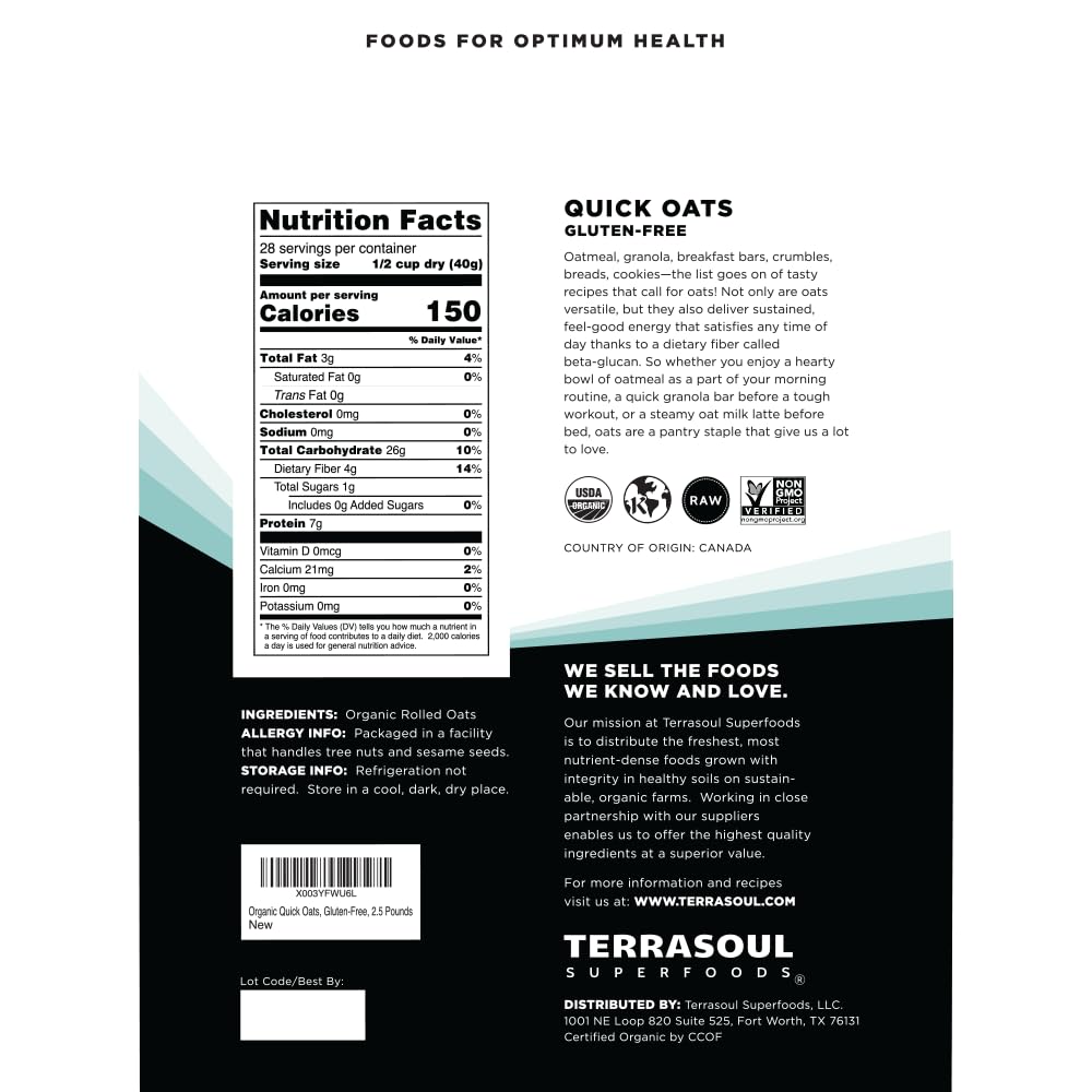 - Q: Are Terrasoul Organic Quick Oats gluten-free? A: Yes, Terrasoul Organic Instant Quick Oats are certified gluten-free, making them a safe choice for individuals with gluten sensitivities or celiac disease. You can enjoy a hearty and nutritious breakfast without worrying about gluten contamination.