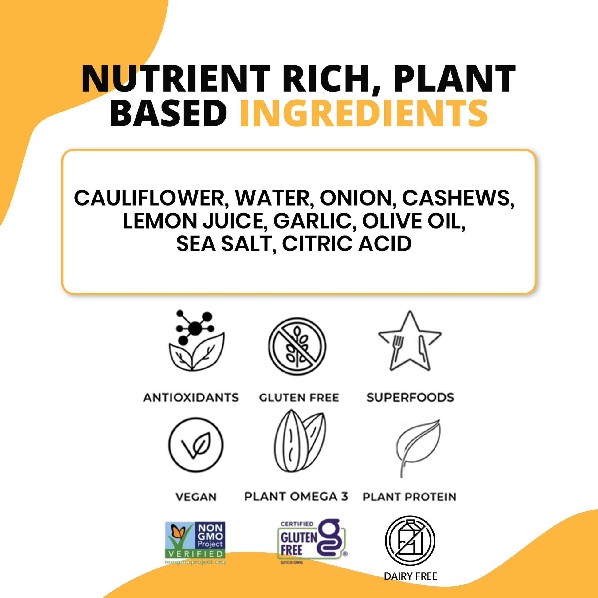 Creamy Indulgence - Savor The Rich And Velvety Taste Of Our Dairy Free Alfredo Sauce, Made From Creamy Cashews, Roasted Garlic, & Cauliflower. This Plant-Based Alfredo Sauce Jar Is A Guilt-Free Way To Elevate Your Everyday Meals. | Vegan & Delicious - Who Says Vegan Can'T Be Delicious This Gluten-Free Alfredo Sauce Blends Garlic & Cauliflower Into A Creamy Delight. Whether You'Re Vegan Or Want A Tasty Meal, This Pasta Sauce Perfect For The Whole Family. | Versatility At Its Best - From Creamy Pasta To White Pizza, Roasted Veggies, Or Even As A Dip This Alfredo Pasta Sauce Has Beautiful Versatility. It Enhances Everyday Dishes, Making It A Kitchen And Pantry Must-Have! | Powerhouse Of Nutrients - Packed With Vitamin A, B, C, D, K, & E, This Organic Alfredo Sauce Is A Treat For Your Taste Buds & A Boost For Your Body. It
