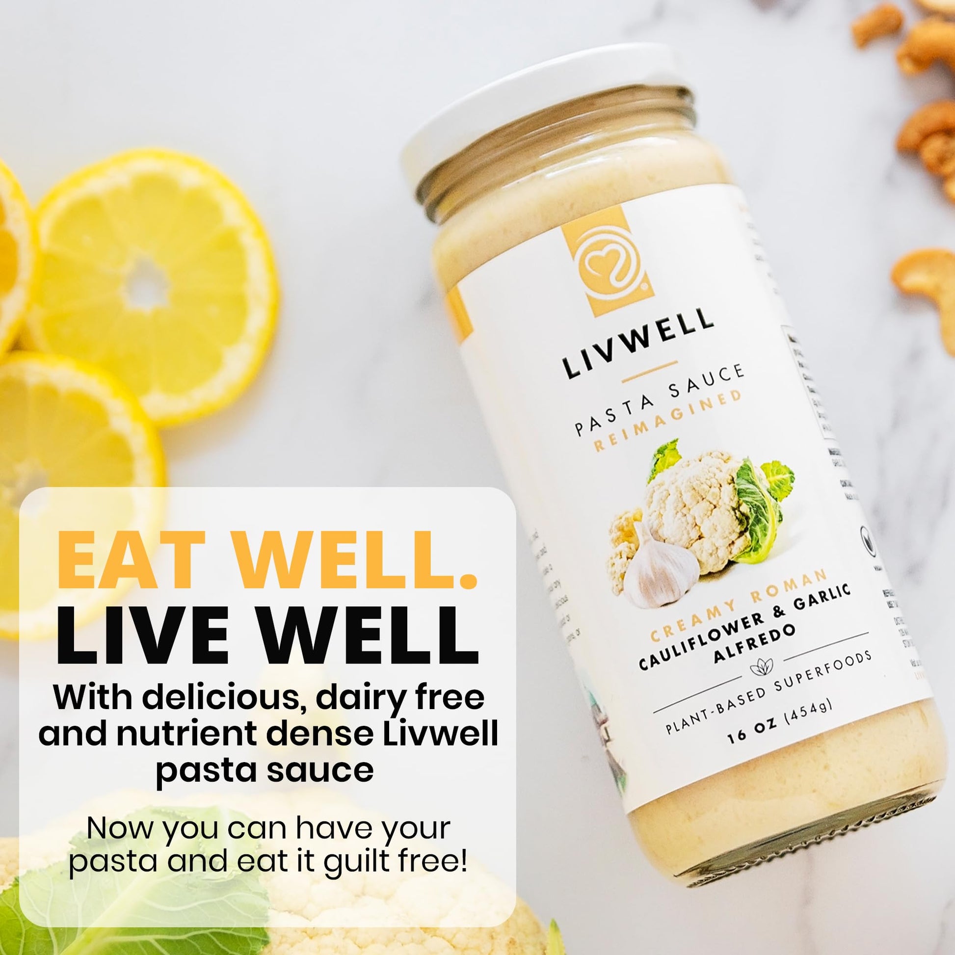 Q: Is Livwell Dairy-Free Cauliflower Pasta Sauce suitable for a vegan diet?A: Yes, Livwell Dairy-Free Cauliflower Pasta Sauce is entirely plant-based and vegan, making it a delicious choice for those following a vegan diet.