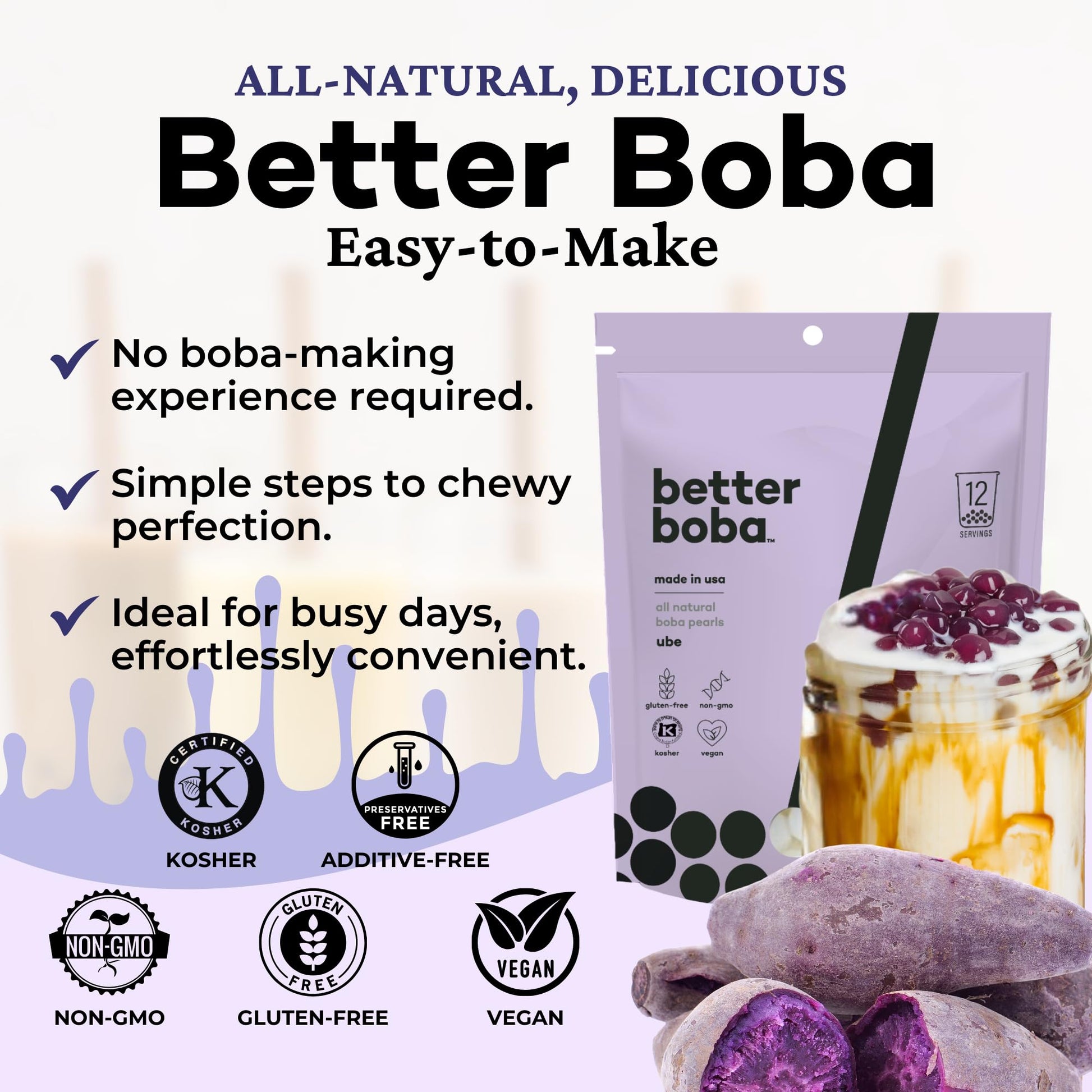 - Q: How do I prepare Better Boba Ube Boba Pearls for bubble tea? A: Preparing Better Boba Ube Boba Pearls is simple. Just follow the cooking instructions on the package. Typically, you’ll boil water, add the boba pearls, and cook until they become soft and chewy. Once cooked, rinse them with cold water and they're ready to be added to your favorite drinks or desserts.