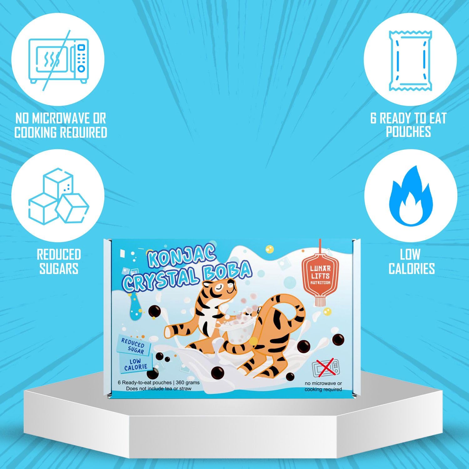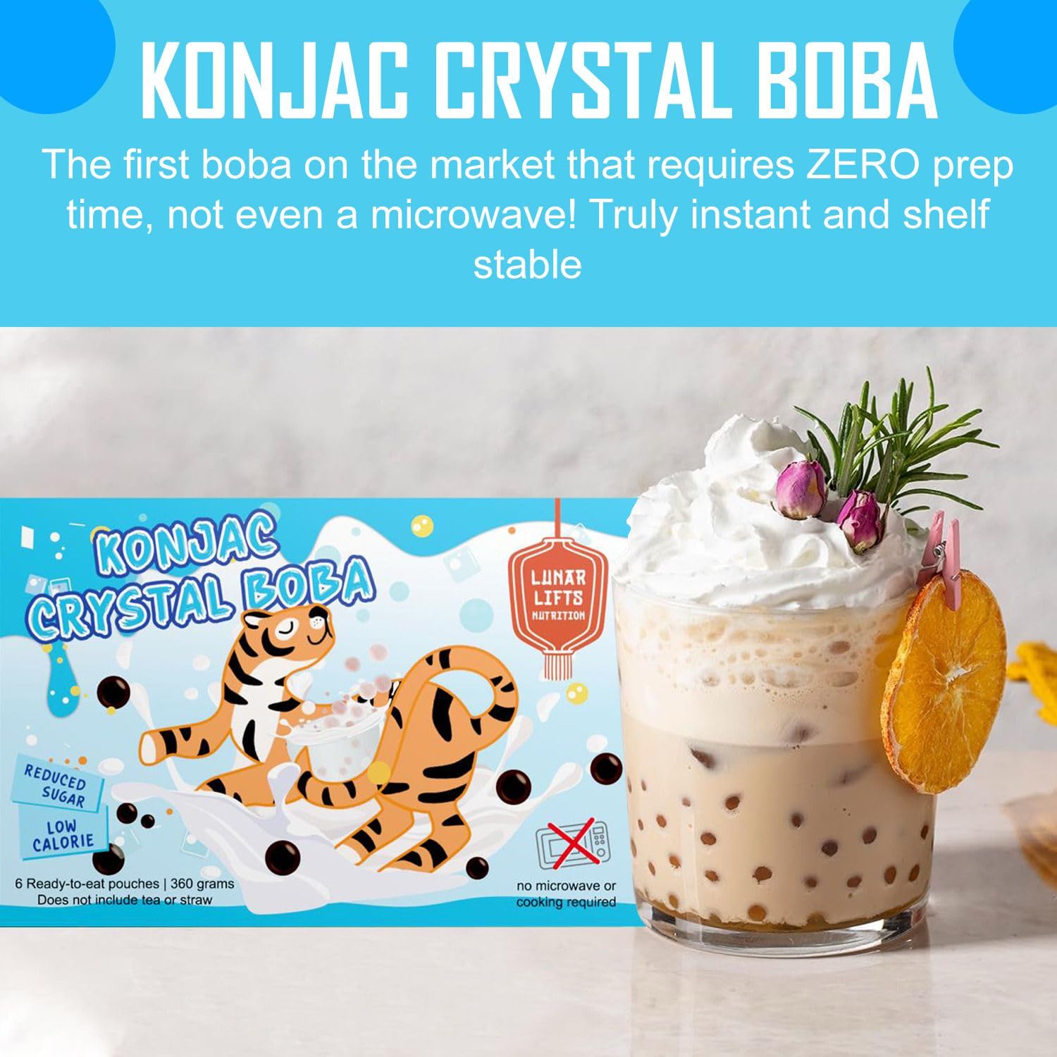 - Q: How many pouches are included in a package of Konjac Crystal Boba? A: Each package contains six ready-to-eat pouches, totaling three hundred sixty grams.