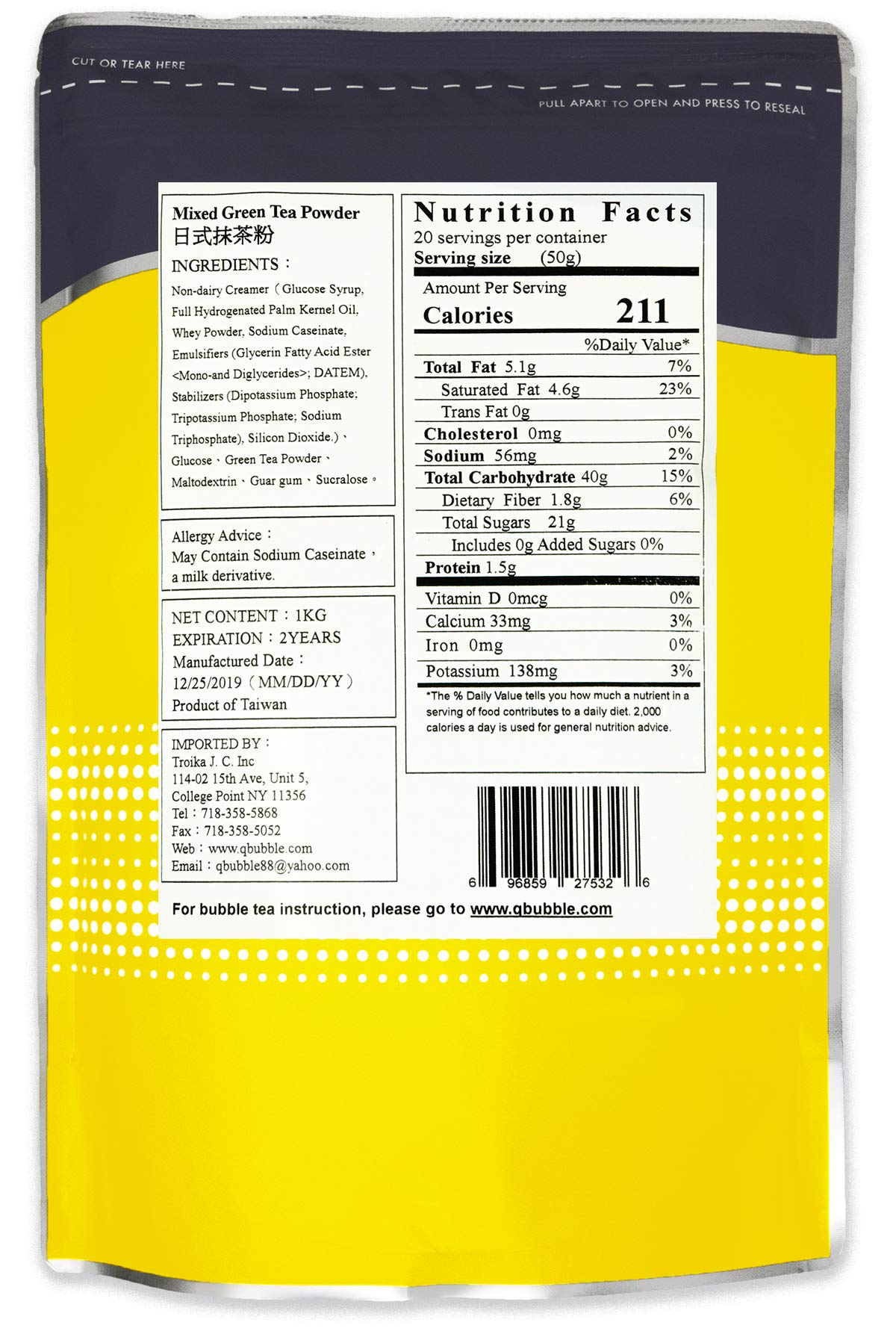 - Q: How do I prepare bubble tea with Qbubble Japanese Green Tea Powder? A: To prepare bubble tea with Qbubble Japanese Green Tea Powder, simply mix the desired amount of powder with water or milk, add your favorite tapioca pearls, and stir well to enjoy a refreshing drink.