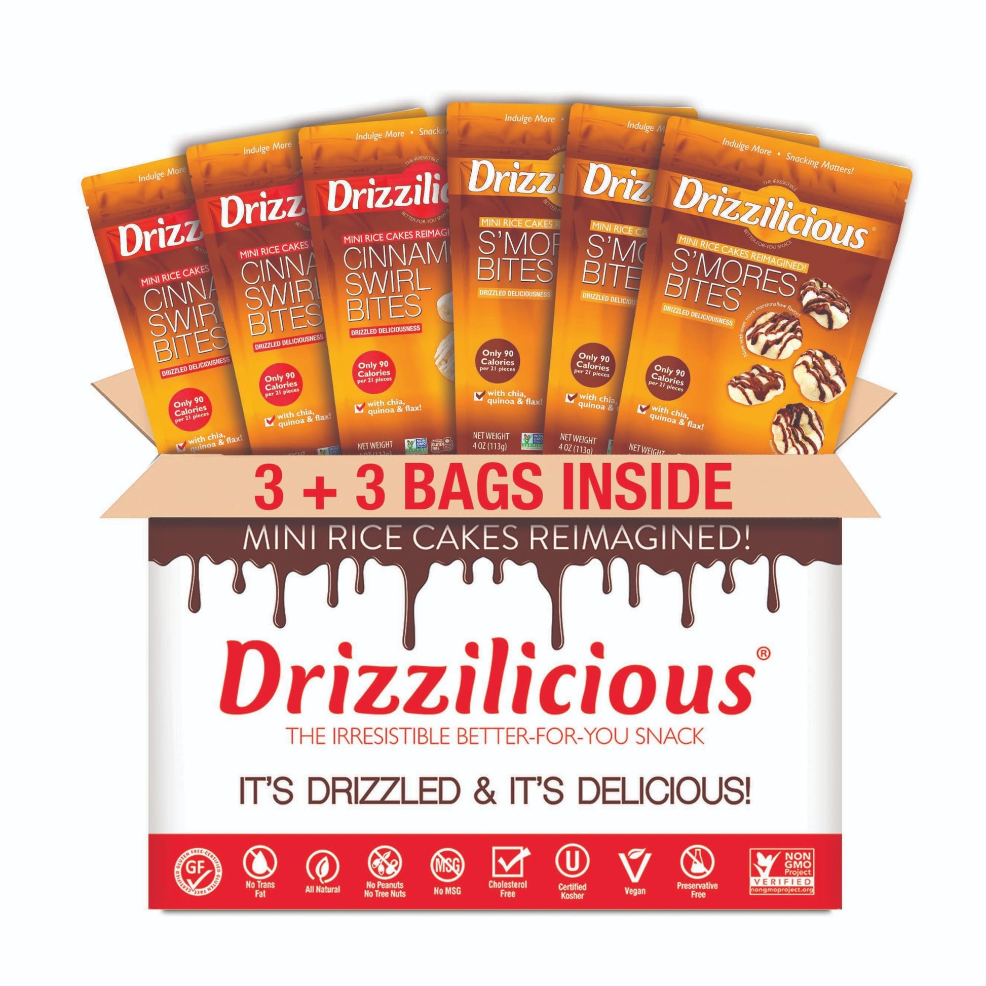 Q: What flavors are available in the Drizzilicious Mini Rice Cakes variety pack?A: The Drizzilicious Mini Rice Cakes variety pack includes two popular flavors: S'mores and Cinnamon Swirl. You can also explore other flavors like Birthday Cake, Cookies & Cream, and Salted Caramel.