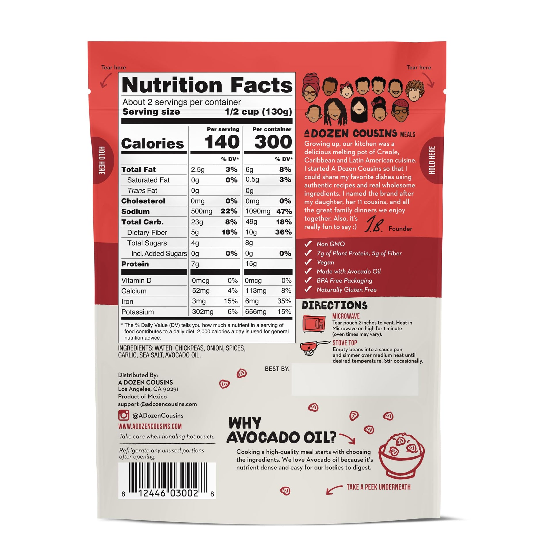 Q: What are A Dozen Cousins Seasoned Beans made from?A: A Dozen Cousins Seasoned Beans are made with simple, wholesome ingredients including water, chickpeas, onions, spices, garlic, avocado oil, and sea salt. They are 100% plant-based and always Non-GMO.