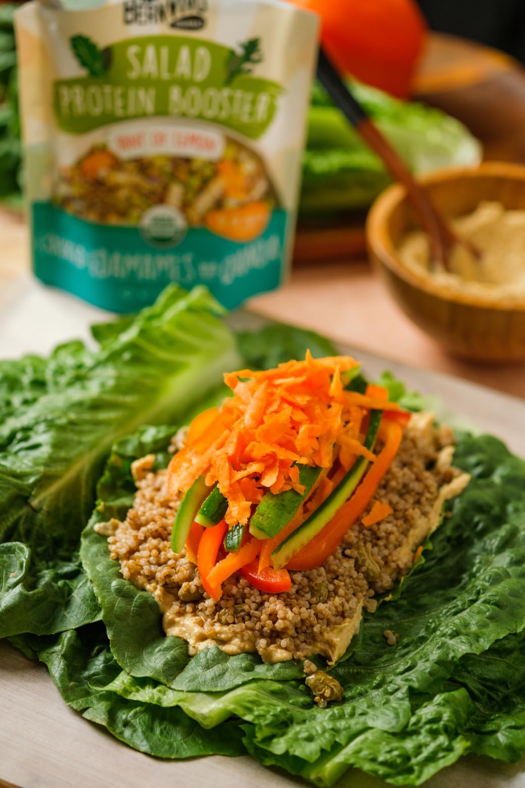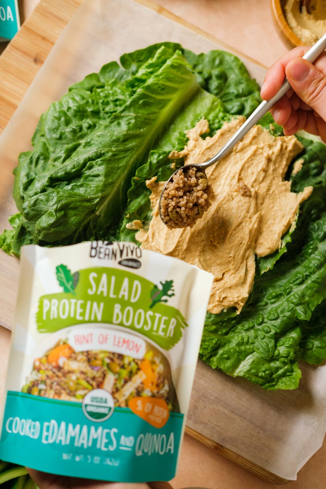 Q: What are the main ingredients in BeanVIVO's Salad Protein Booster?A: BeanVIVO's Salad Protein Booster features a nutritious blend of organic cooked edamame, quinoa, and a hint of lemon, providing a delightful burst of flavor and essential nutrients.