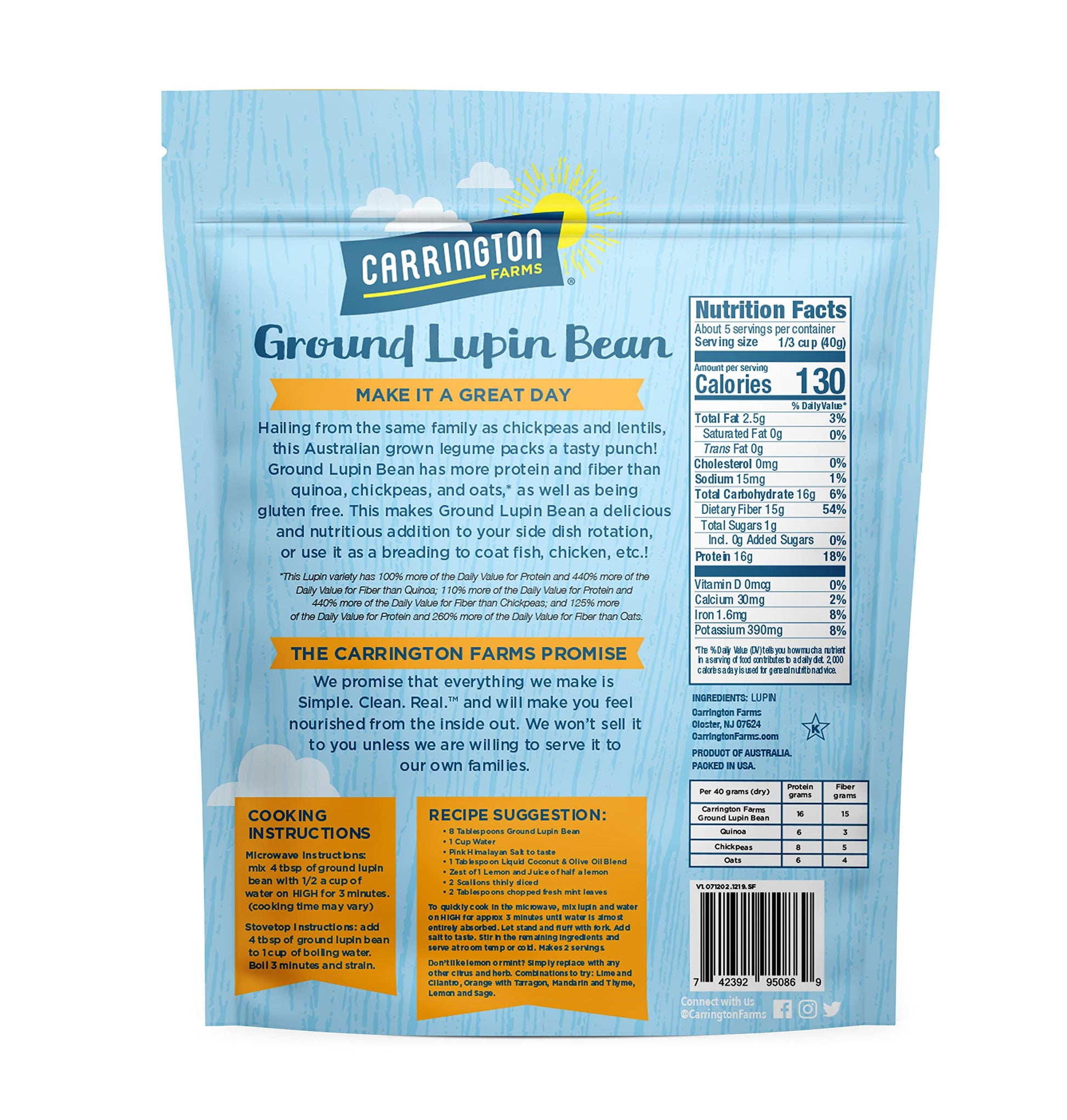 - Q: What are the nutritional benefits of Carrington Farms Ground Lupin Bean? A: Carrington Farms Ground Lupin Bean is rich in nutrients, offering 16g of protein and 15g of fiber per serving, making it a great plant-based protein alternative. With only 1 gram of net carbs, it's an excellent keto-friendly option for healthy meals.