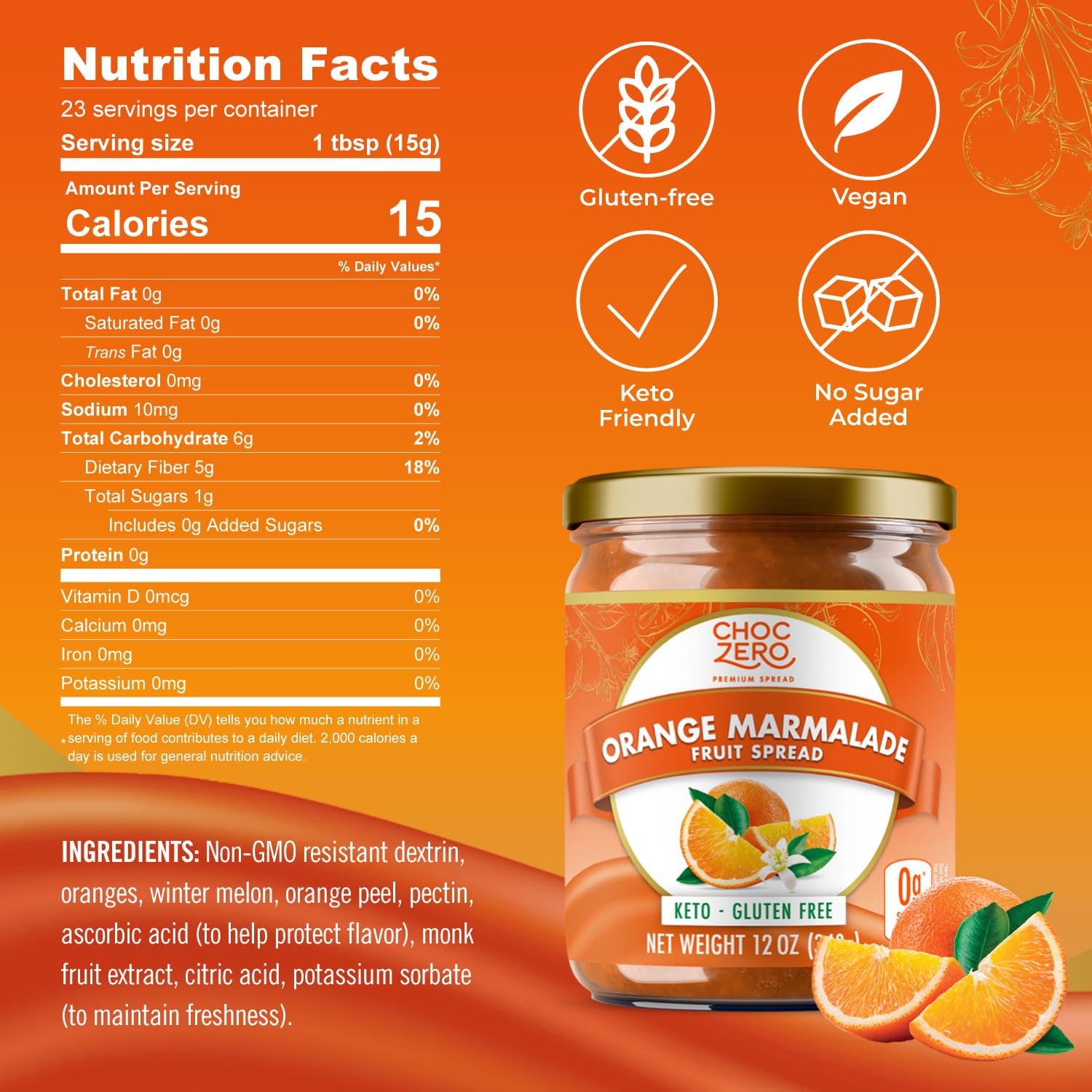 Q: What are the nutritional benefits of ChocZero Sugar Free Orange Marmalade?A: ChocZero Sugar Free Orange Marmalade is high in prebiotic fiber and low in calories, contributing to a healthier breakfast option while providing essential nutrients without the added sugar.