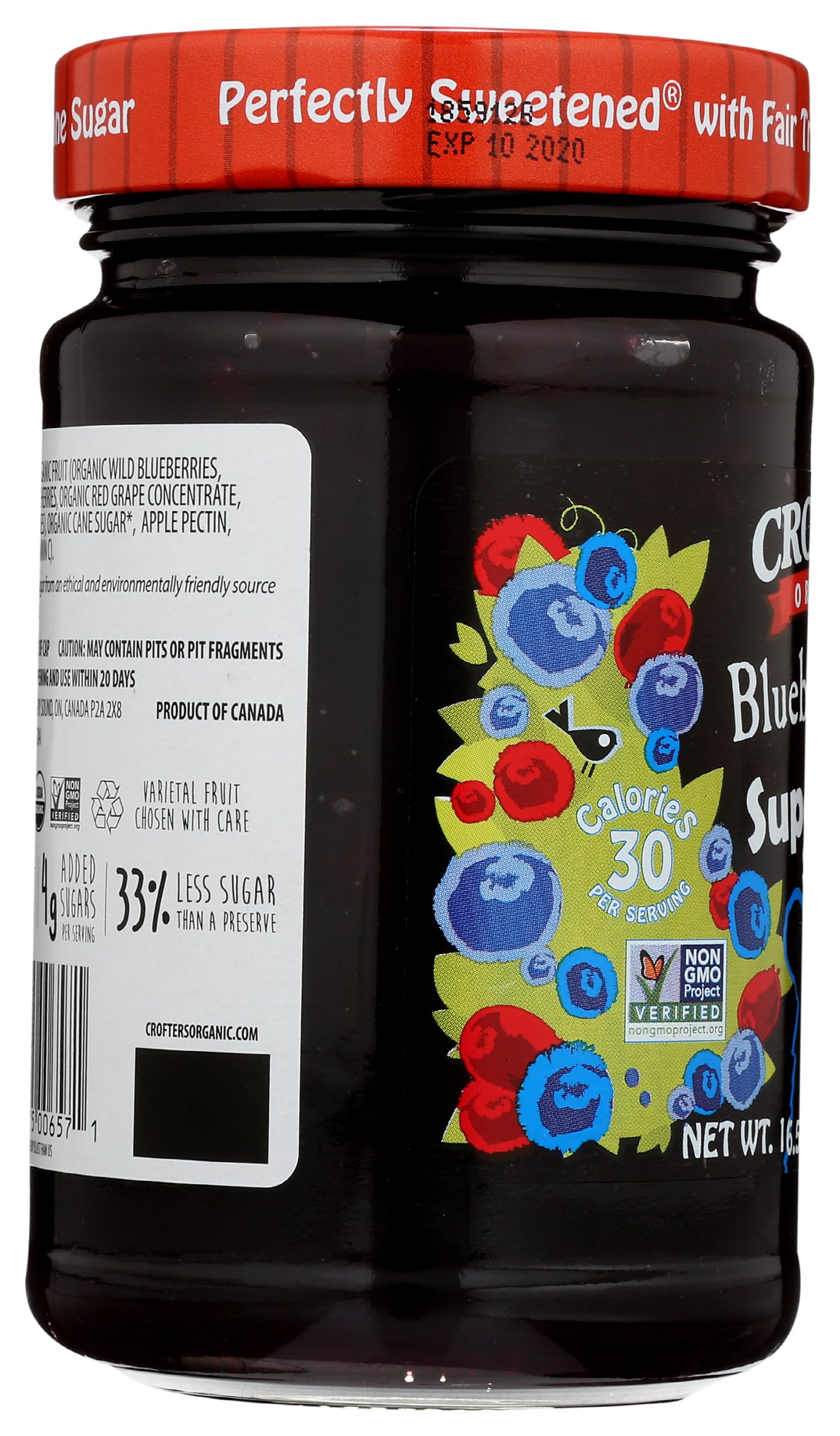 - Q: What are the health benefits of Crofters Organic Blueberry Blast Superfruit Spread? A: Crofters Organic Blueberry Blast Superfruit Spread is high in antioxidants due to its fruit content and is lower in sugar, making it a healthier alternative to traditional spreads.