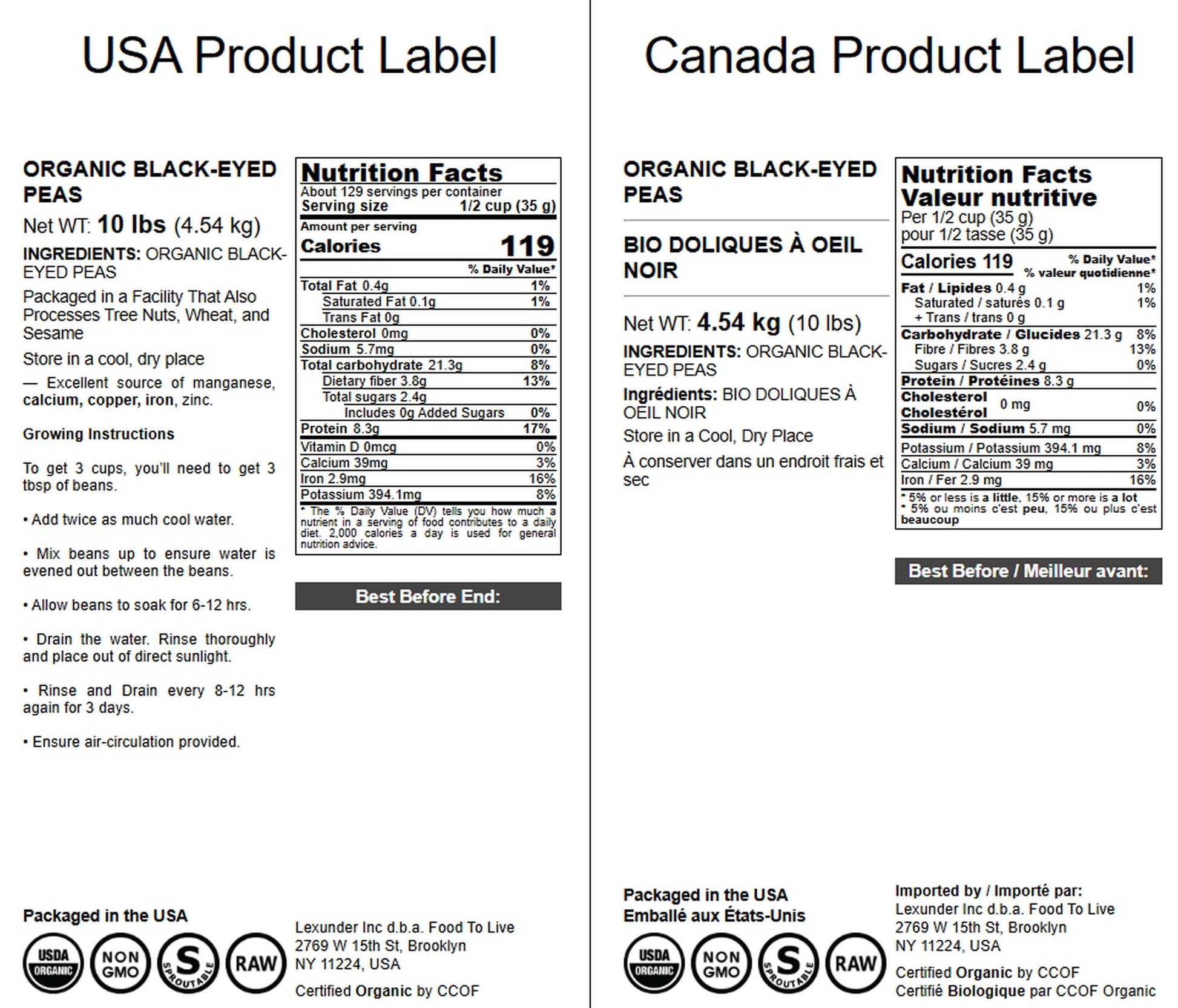 Organic Black-eyed beans, also called cowpeas or black-eyed peas, are one of the most popular organic legumes. They are delicious and extremely versatile. Their high nutritional value and low calorie count makes them one of the best choices for weight loss diets. As they are rich in protein, they are a great meal choice for vegetarians and vegans. Nutritional Value Food to Live Organic Black-Eyed Beans can help you meet your daily dose of B vitamins, as well as vitamin A, iron, and potassium. They are packed with dietary fiber, which helps normalize digestion and can facilitate weight loss. Organic Black-eyed peas are the #1 food source of folate. Directions High versatility is one of the best features of organic black-eyed beans. You can cook them rather fast (soaking overnight is not mandatory), 20-30 minutes of full boil would do. Use them in salads or stews. Cook with spices or make delicious spreads. This product is processed in a facility that also processes tree nuts and wheat.
