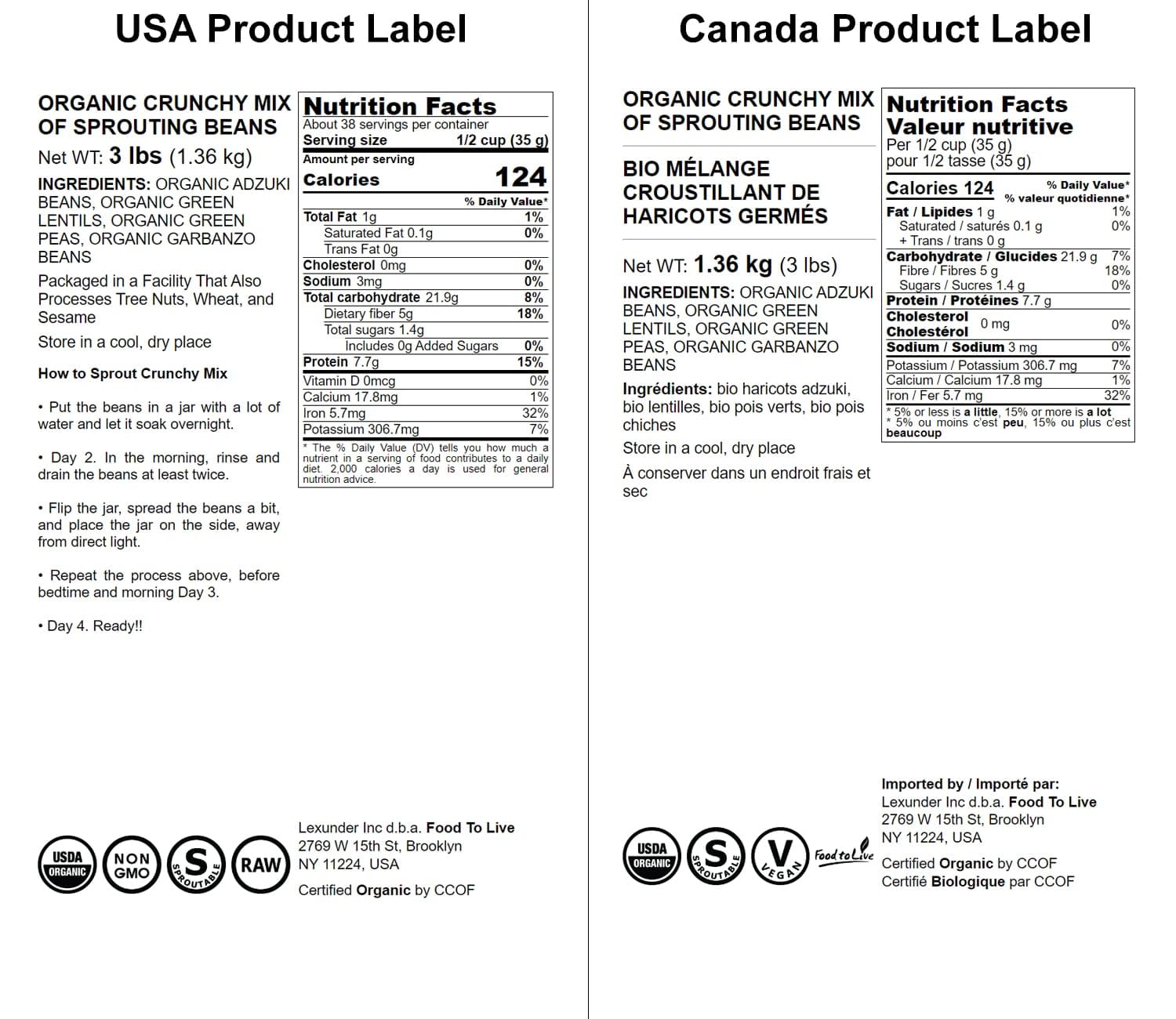 - Q: What are the benefits of using Food to Live Organic Crunchy Mix of Sprouting Beans? A: The Food to Live Organic Crunchy Mix of Sprouting Beans is packed with nutrients and offers a high germination rate, making it an excellent choice for health enthusiasts. This mix includes organic green peas, adzuki beans, lentils, and garbanzo beans, which provide essential proteins, vitamins, and minerals, promoting overall health.