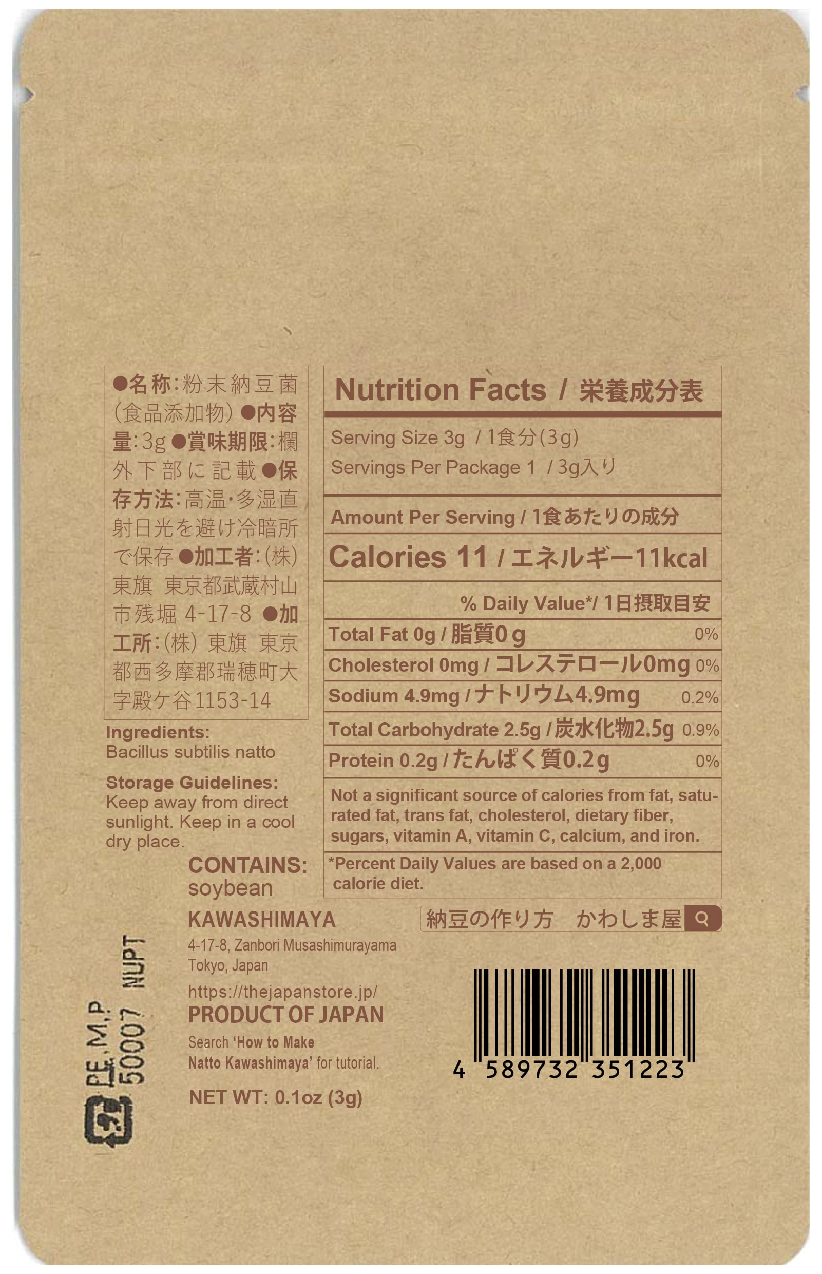 Natto Starter Spores Powder - Extracted From Organic Soybeans, 100% Purely Cultured Natto Bacteria For Making Natto (Bacillus Subtilis Natto:1X10^10 Cfu/G). Non Gmo, Organic, 100% Made In Japan. Natto Starter Culture By Kawashimaya Is Easy To Use Even For First-Timers Who Want To Make Delicious Natto At Home Because It Has A Strong Fermentation Culture Ability. This 3G (0.1Oz) Package Can Make Up To 10-30Kg (22-66 Lbs) Of Natto. For First-Timers, Let'S Use More Natto Starters As A Guide (2X Or 3X). The More Natto Starter Used Can Increase The Possibility Of Success. Be Sure To Sanitize The Tools Before Making Natto. What Is Natto? The Japanese Superfood Made From Fermented Soybeans. It Has A Unique Flavor And Sticky Strings. Delicious To Enjoy With Rice, Soups, And Noodle Dishes For Everyday Consumption. Rich In Raw Probiotics, Proteins, Vitamin K, Dietary Fibers, Isoflavones, Which Are Good For Your Health And Beauty. English Instruction About How To Make Natto Will Be Sent By Email. Store The Natto Starter In A Refrigerator (Cold And Dark Place) With Low Humidity. Immediately Use After Opening.