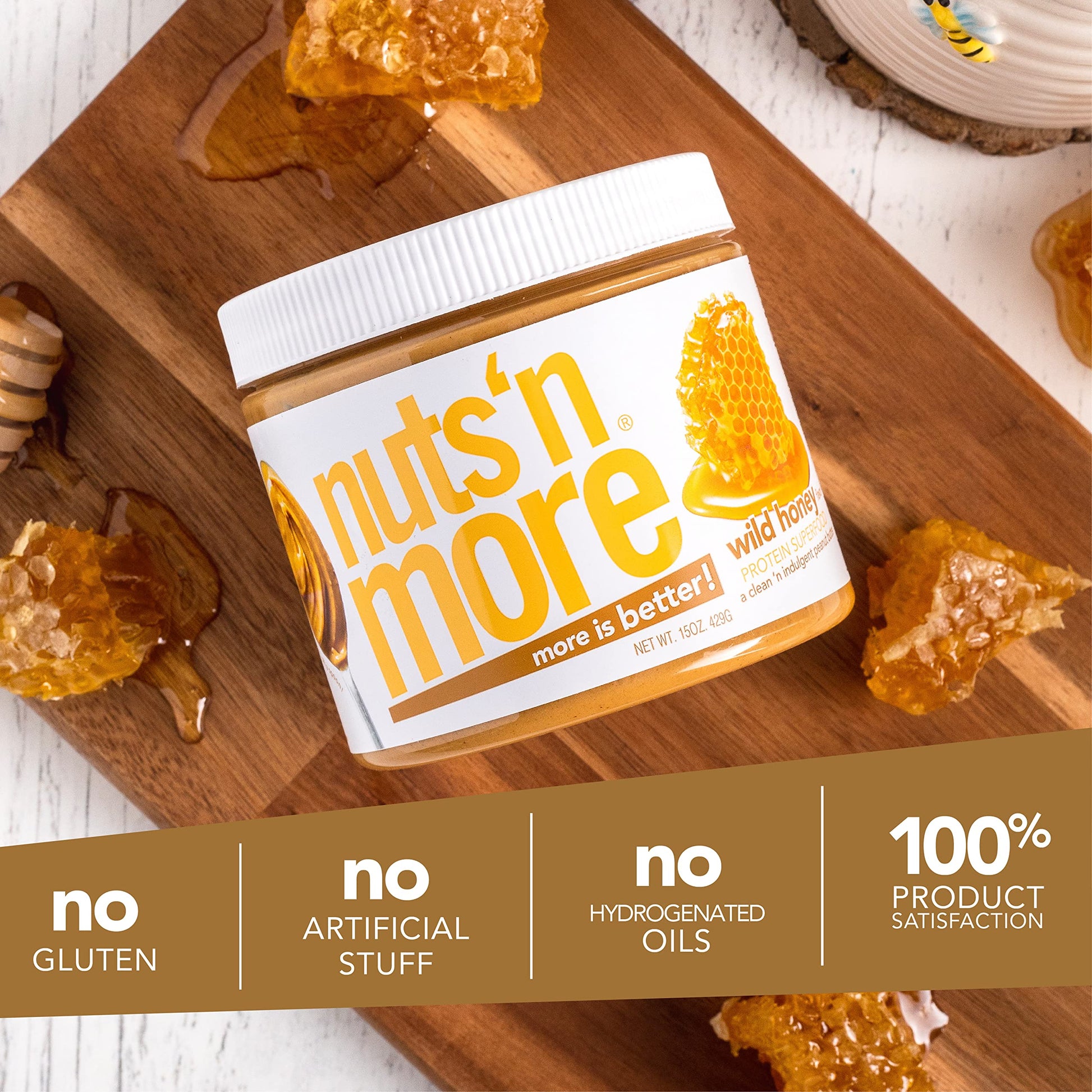 - Q: What makes Nuts ‘N More Wild Honey Peanut Butter Spread different from regular peanut butter? A: Nuts ‘N More Wild Honey Peanut Butter Spread contains nearly double the protein of traditional peanut butter, thanks to the inclusion of high-quality whey protein. Additionally, it is free from fillers and binders, offering a clean and indulgent nut butter option.