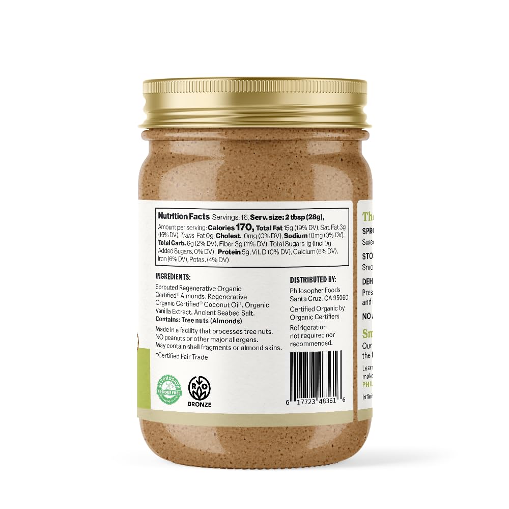 - Q: What ingredients are used in this almond butter? A: This almond nut butter is made from sprouted organic almonds, Regenerative Organic Certified coconut oil, Fair Trade vanilla extract, and ancient seabed salt, offering a natural sweetness and premium quality.