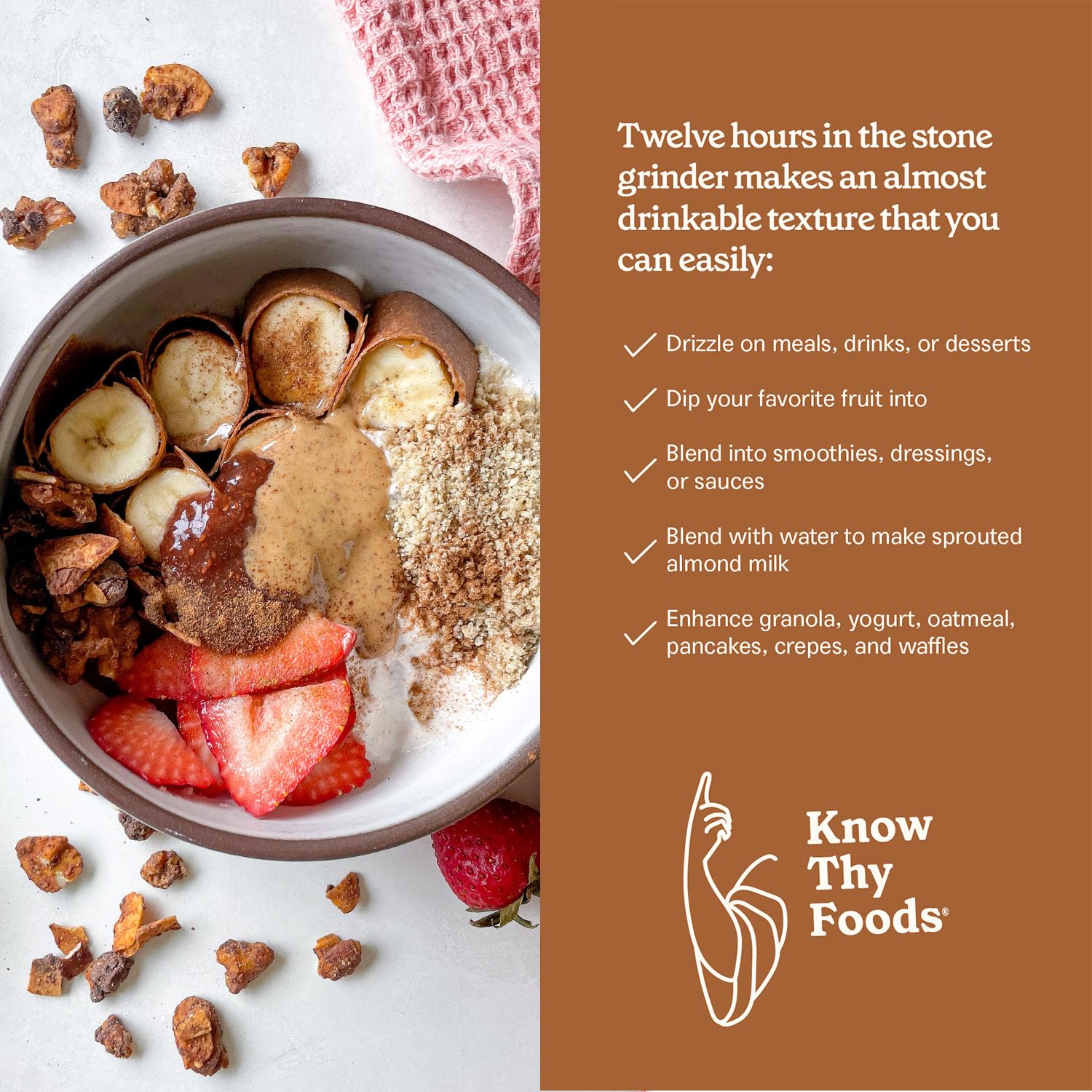 - Q: How can I use Creamy Alchemy Almond Nut Butter in my meals? A: You can enjoy this almond butter in numerous ways. Drizzle it over toast, pancakes, or waffles, dip fruits into it, blend with water to create sprouted almond milk, or add it to your granola or oatmeal for a delicious boost of flavor.