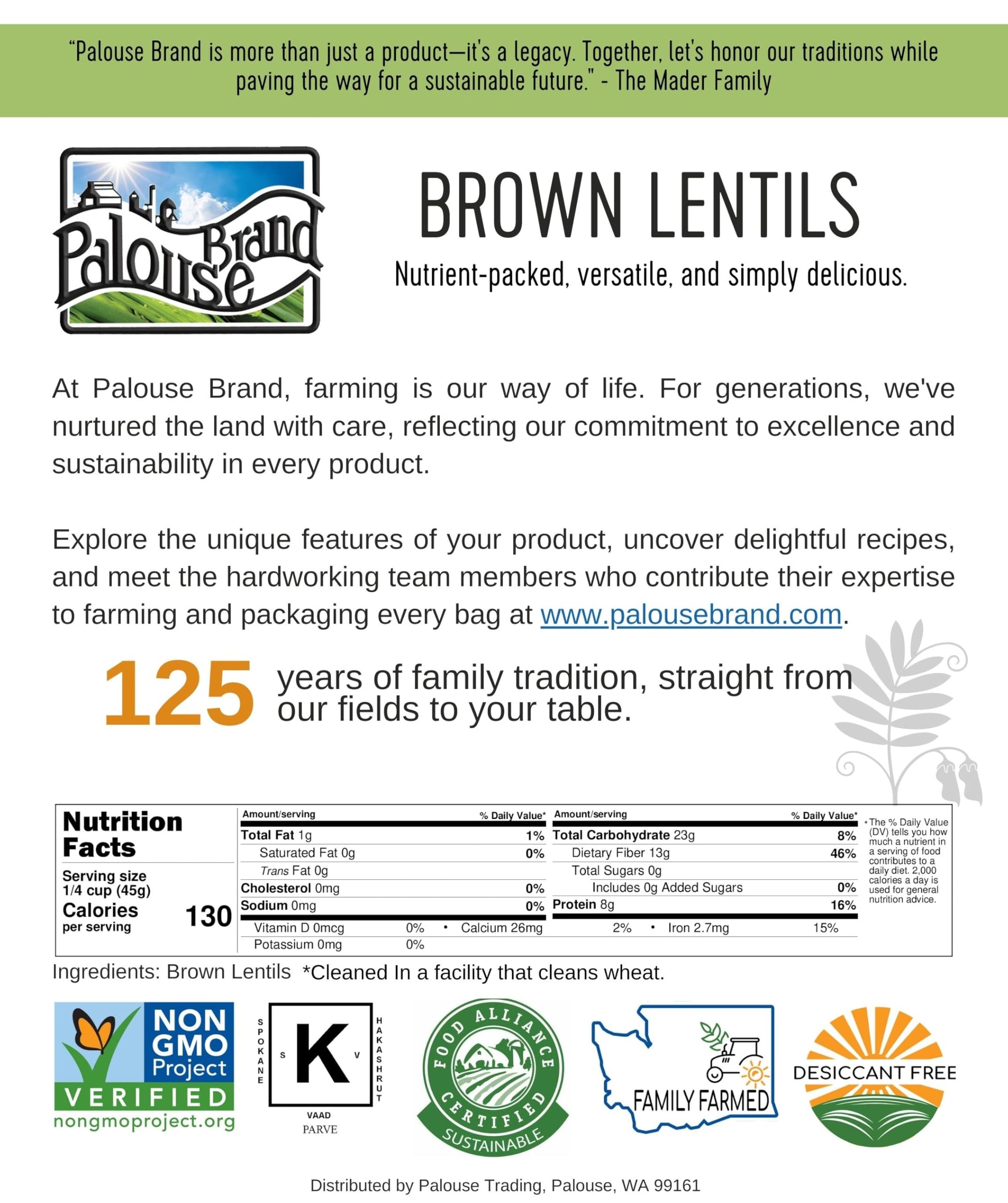 - Q: What makes Palouse Brand small brown lentils different from other lentils? A: Palouse Brand small brown lentils are the Pardina variety, known for their unique flavor and texture, making them a sought-after choice in North American grocery stores. They are certified glyphosate residue-free and Non-GMO Project Verified, ensuring a high-quality and safe product.
