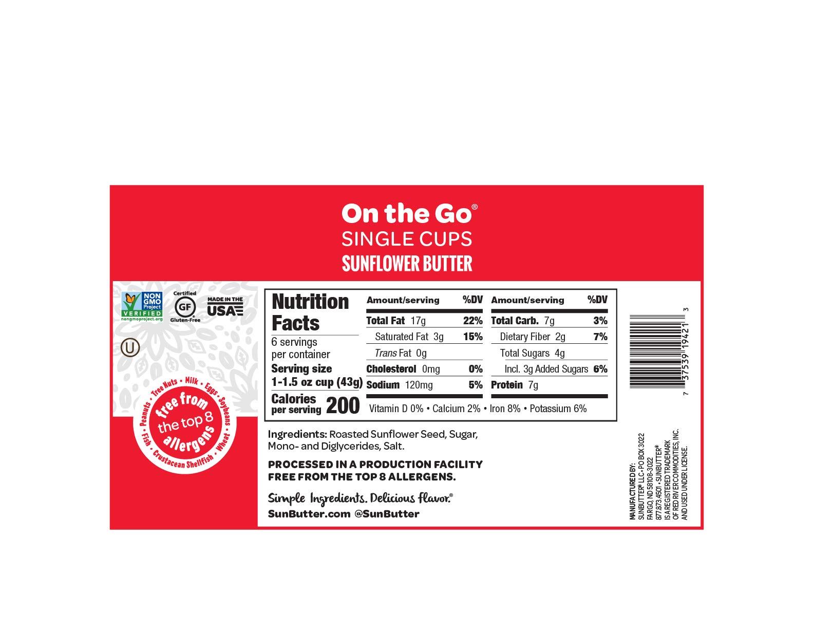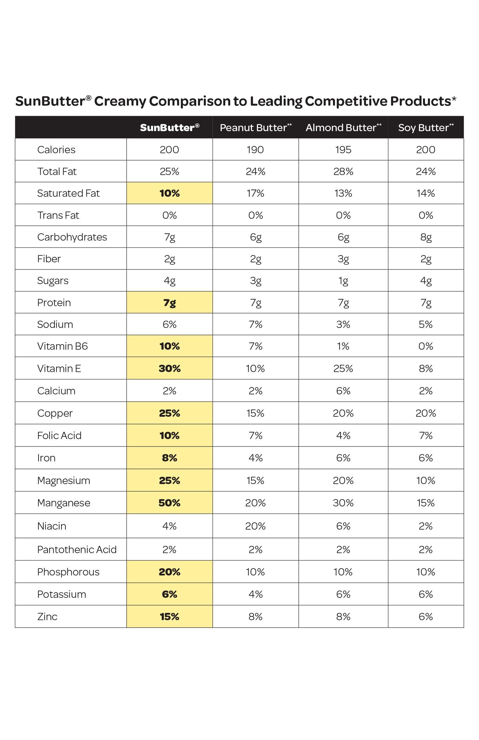 Six convenient 1.5 oz. cups of Creamy SunButter with 9 grams of protein per serving. A great-tasting sunflower butter, SunButter Creamy is smooth and creamy, safe for people with peanut and tree nut allergies, delicious and packed with nutrition. It has 7 grams of protein and more vitamins and minerals than nut butter. Straight from the jar, on a sandwich or in a variety of recipes, kids and adults love it!