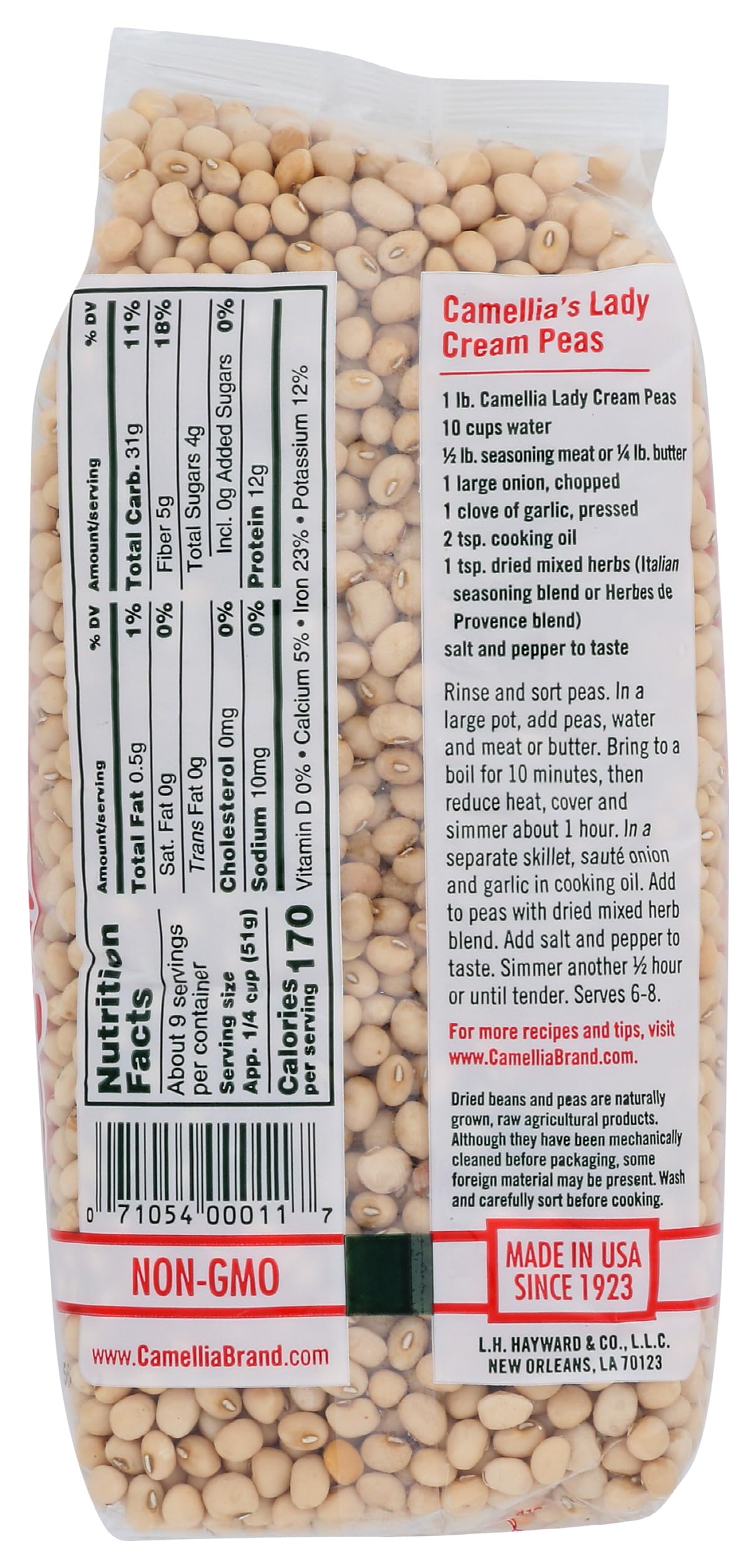 - Q: Where are Camellia Lady Cream Peas sourced from? A: Camellia Lady Cream Peas are USA grown, ensuring quality and freshness. As a family-owned company based in New Orleans, Camellia emphasizes quality in all their beans, peas, and lentils.