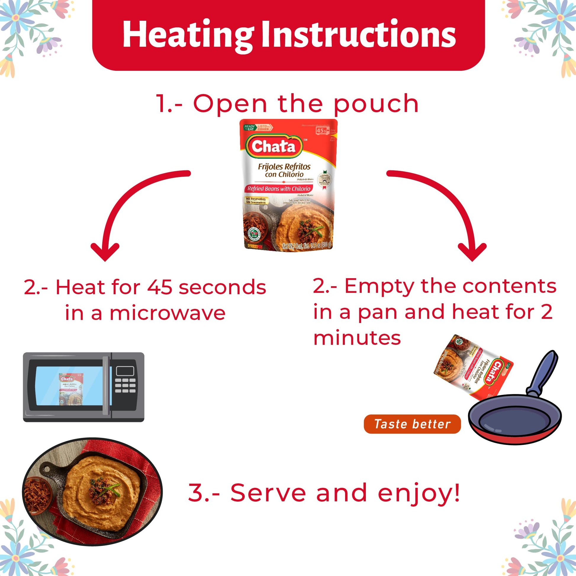 - Q: How do I prepare Chata Refried Beans with Pork Chilorio? A: To prepare Chata Refried Beans with Pork Chilorio, simply open the bag and pour the contents into a pan. Heat for 2 minutes on the stove for the best flavor, or microwave the open bag for 45 seconds until heated through.