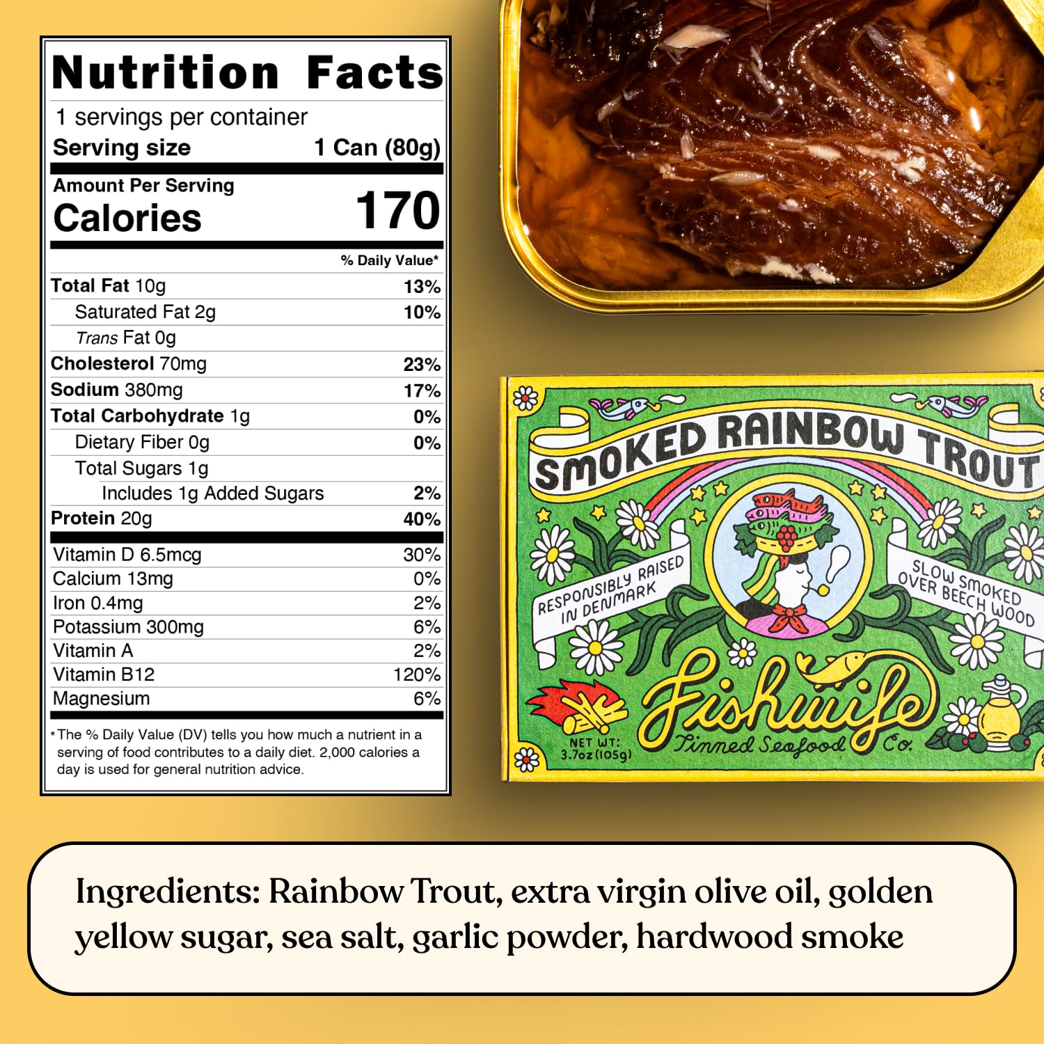 - Smoked Rainbow Trout: Slow-smoked in small batches over beechwood and hand-packed in olive oil, sourced from a micro-cannery near Copenhagen.