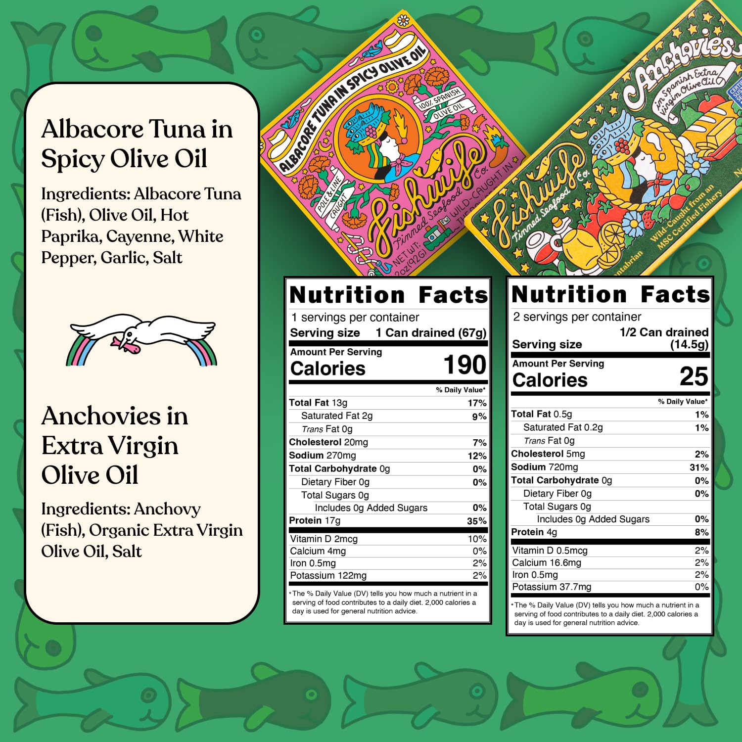 - Q: Where are the fish sourced from? A: The fish in the Fishwife Holiday Gift Set is sourced from various locations, including Cantabria for anchovies, Cornwall for sardines, and a traditional Spanish cannery for tuna. Each fish is carefully selected for quality.