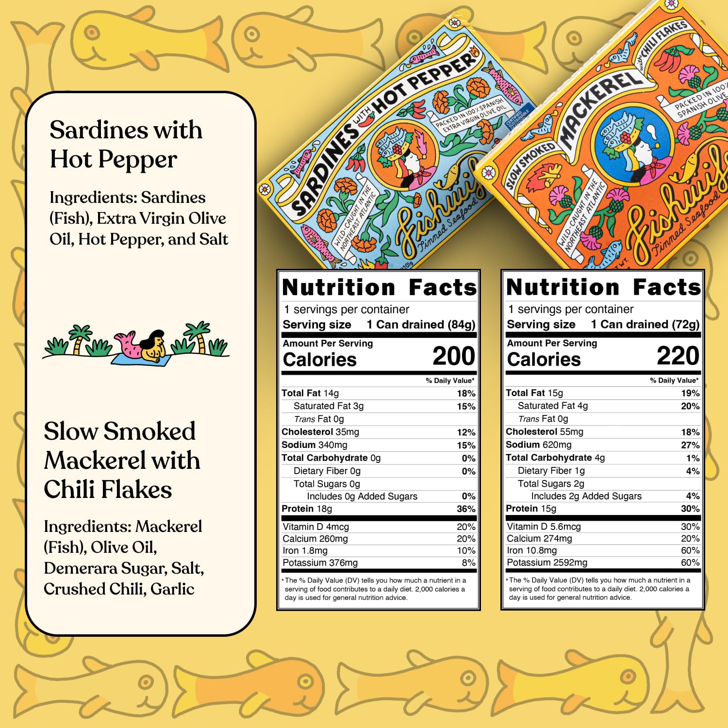 - Q: What types of fish are included in the Fishwife Holiday Gift Set? A: The Fishwife Holiday Gift Set includes a variety of five different tinned fish: Cantabrian Anchovies, Sardines with Hot Pepper, Albacore Tuna in Spicy Olive Oil, Smoked Mackerel, and Smoked Rainbow Trout.