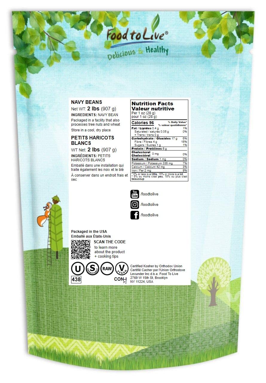 Food To Live Navy Beans, 2 Pounds Raw, Dried, Vegan, Kosher, Whole Small White Kidney Beans In Bulk, Good Source Of Protein, Fiber, Folate, And Copper. Low Sodium. Great For Cooking And Soups