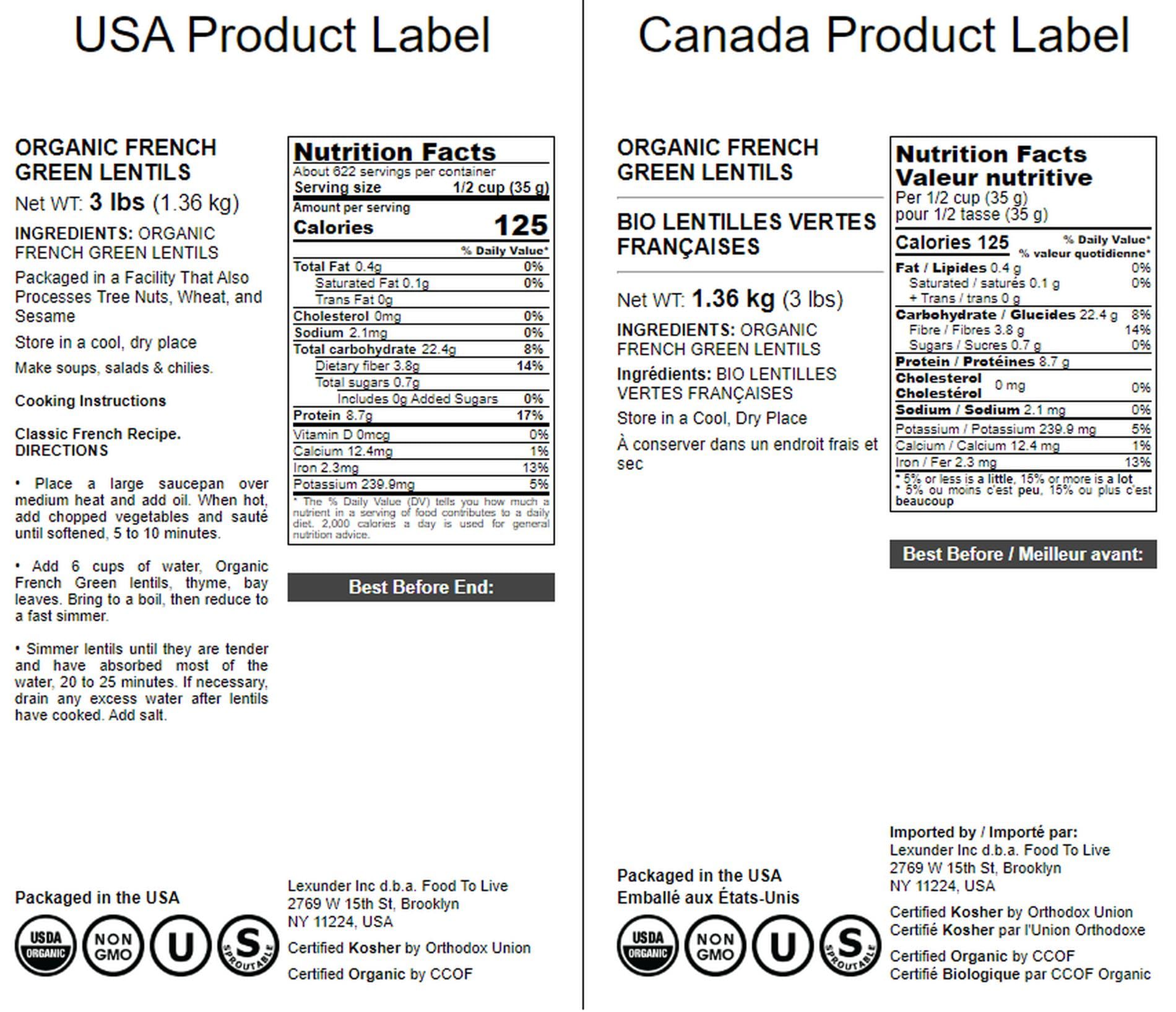 Description— Kosher, Non-GMO, Organic, Raw, Sproutable, Vegan — Whole Raw Lentils — Very low in Saturated Fat, Cholesterol, and Sodium — A Good Source of Thiamin, Iron, Phosphorus, Manganese, Dietary Fiber, and Folate Organic French Green lentils: Rich in Flavor and Texture Organic French Green Lentils is a rare type of lentil, smaller and firmer than the regular green one. First grown in France, today they are a popular ingredient in many European dishes. French Organic Lentils is a diverse cooking ingredient so that you can use them in many fabulous meals. They take a bit longer to cook and remain firm due to their texture. Eating lentils regularly is beneficial, not only because they are low in calories, but they are an excellent plant-based source of protein, fiber, B vitamins, and some essential minerals. It’s a Keeper! How to Eat Organic French Green Lentils Organic French lentils taste amazing in chilies and stews. Since they retain shape instead of turning mushy, it helps define the taste of some familiar dishes. The peppery flavor of the lentils gives an exciting addition to many savory recipes. You can cook organic French lentils in large portions and store them in the fridge for up to a week. Add cooked lentils to salads or hummus, or mix them with other beans, onion, and spices to make veggie burgers. French Organic Lentils also used in light soups where the firm texture of the legume is prominent. Organic French lentils don’t have to be pre-soaked before cooking. Rinse through with cold water, bring to the boil, and simmer for 20-30 minutes. Add seasoning at the end of the cooking process._Nutrition Facts 1 servings per container Serving size1 oz (28 g) Amount Per Serving Calories97 % Daily Value* Total Fat 0.3g 0% Saturated Fat 0.04g 0% Trans Fat 0g Cholesterol 0mg 0% Sodium 2mg 0% Total carbohydrate 17g 6% Dietary fiber 9g 31% Total sugars 1g Includes 0g Added Sugars 0% Protein 7g 15% Vitamin D 0mcg 0% Сalcium 16mg 1% Iron 2mg 12% Potassium 271mg 6% Folate 136mcg 34% Thiamin 0.2mg 21% Copper 0.1mg 16% Manganese 0.4mg 16% Zinc 1mg 12% Phosphorus 128mg 10% Vitamin B6 0.2mg 9% Magnesium 35mg 8% Riboflavin 0.1mg 5% Niacin 1mg 5% Selenium 2mcg 4% Vitamin С 1mg 1% Vitamin E 0.1mg 1% Vitamin K 1mcg 1% * The % Daily Value (DV) tells you how much a nutrient in a serving of food contributes to a daily diet. 2,000 calories a day is used for general nutrition advice. Ingredients: ORGANIC FRENCH GREEN LENTILS Storage Time: Up to 4 years Country of Origin: the USA Packaged in: the USA Store in: Cool, Dry Place Allergy Info: Packaged in a Facility That Also Processes Tree Nuts, Wheat, and Sesame Kosher Non-GMO Organic Raw Sproutable Vegan