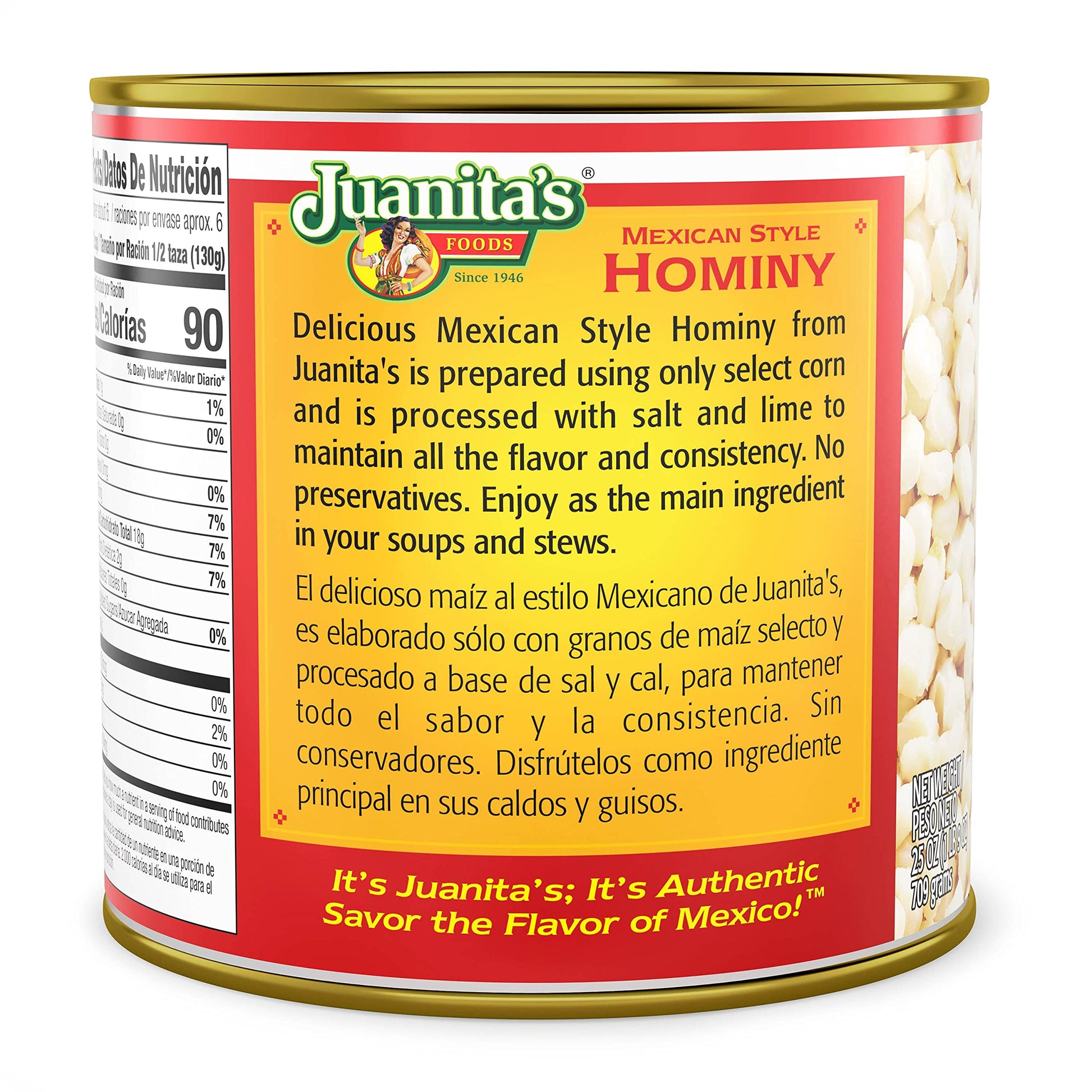 Delicious Mexican Style Hominy From Juanita'S Is Prepared Using Only Select Corn And Is Processed With Salt And Lime To Maintain All The Flavor And Consistency. No Preservatives. Enjoy As The Main Ingredient In Your Soups And Stews.