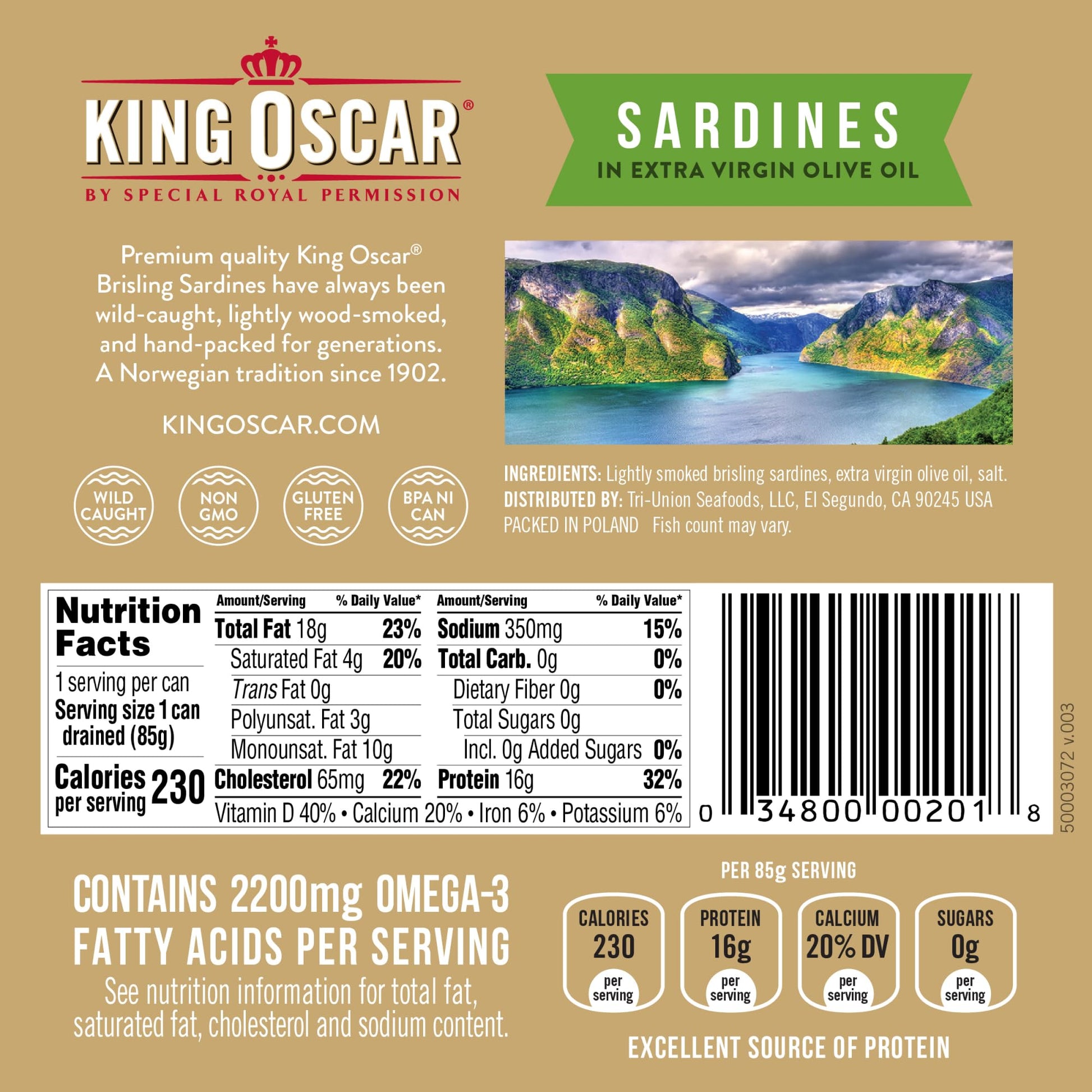King Oscar brisling sardines are sourced from Norways pristine fjords, known for their icy waters that produce the smallest and best-tasting sardines. Each can is meticulously cross-packed by hand, ensuring the integrity and quality of the fish. The sardines are authentically oak wood-smoked, providing a mild flavor that appeals to seafood lovers. With only three simple ingredients, these sardines are a clean and wholesome choice, free from GMOs, gluten, and added sugars.