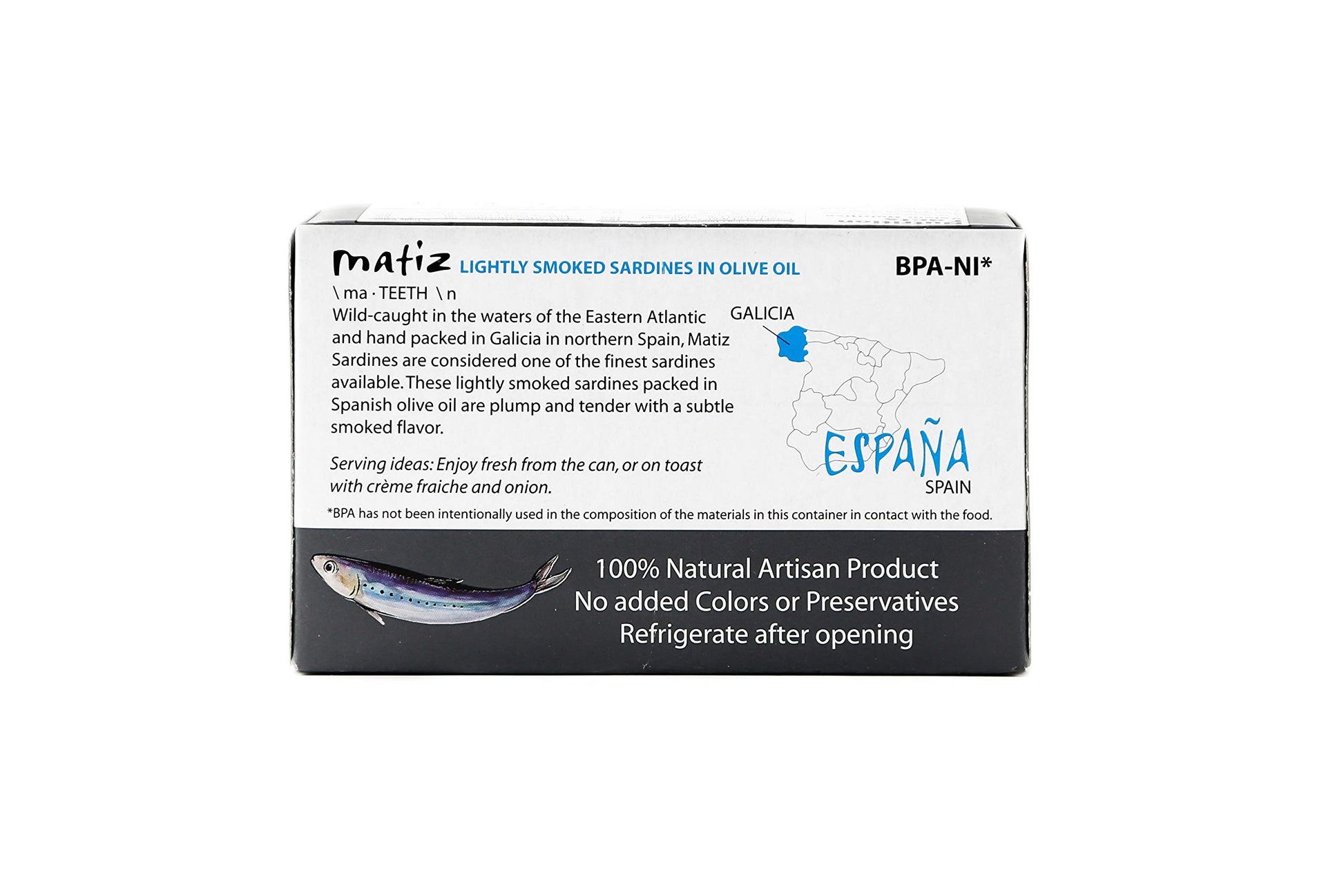 - Q: What are Matiz Sardines made of? A: Matiz Sardines are made from wild-caught sardines sourced from the Eastern Atlantic. They are hand-packed in high-quality Spanish olive oil, ensuring a rich and natural flavor.