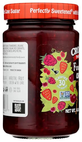 - Q: What are the ingredients in CROFTERS Organic Four Fruit Premium Spread? A: CROFTERS Organic Four Fruit Premium Spread typically includes a blend of organic fruit, such as strawberries, raspberries, blueberries, and blackberries, along with organic cane sugar, pectin, and citric acid. It is free from artificial preservatives and colors.