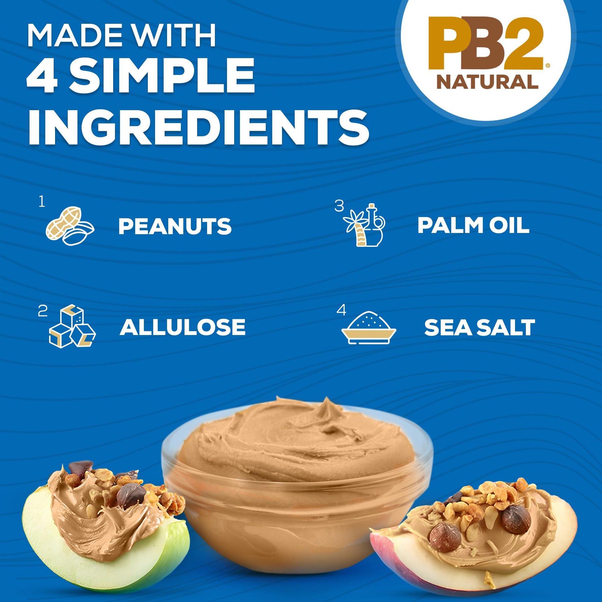 Q: What are the main ingredients in PB2 Natural Creamy Peanut Butter?A: PB2 Natural Creamy Peanut Butter is made with four simple ingredients: fresh roasted peanuts, palm oil, a dash of sea salt, and allulose, a naturally derived sweetener with zero added sugar.