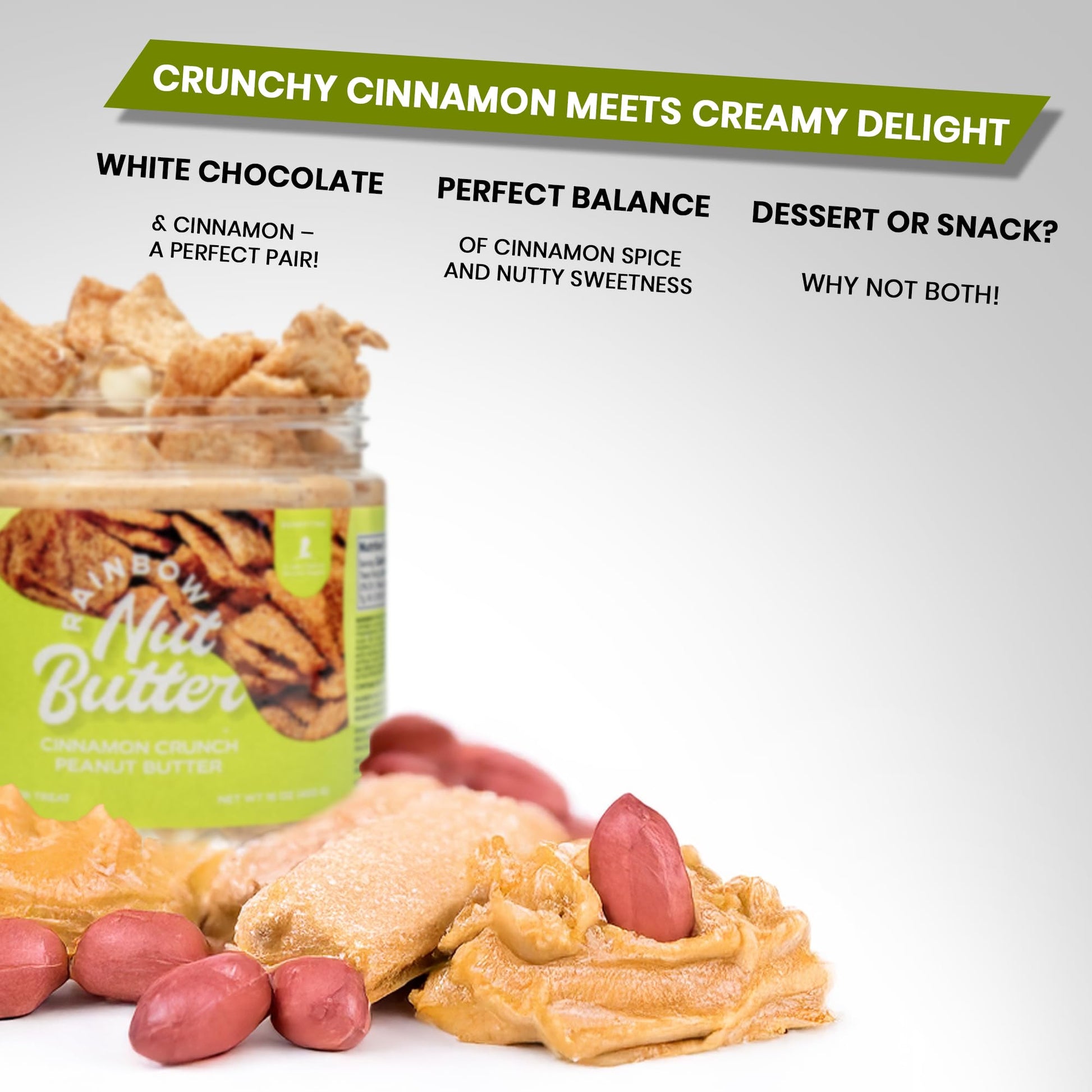 - Q: What makes Cinnamon Crunch Peanut Butter different from regular peanut butter? A: Cinnamon Crunch Peanut Butter combines the nutty richness of traditional peanut butter with the nostalgic flavors of Cinnamon Toast Crunch cereal, featuring crispy cereal pieces and creamy white chocolate chips for a unique sweet and spicy taste experience.