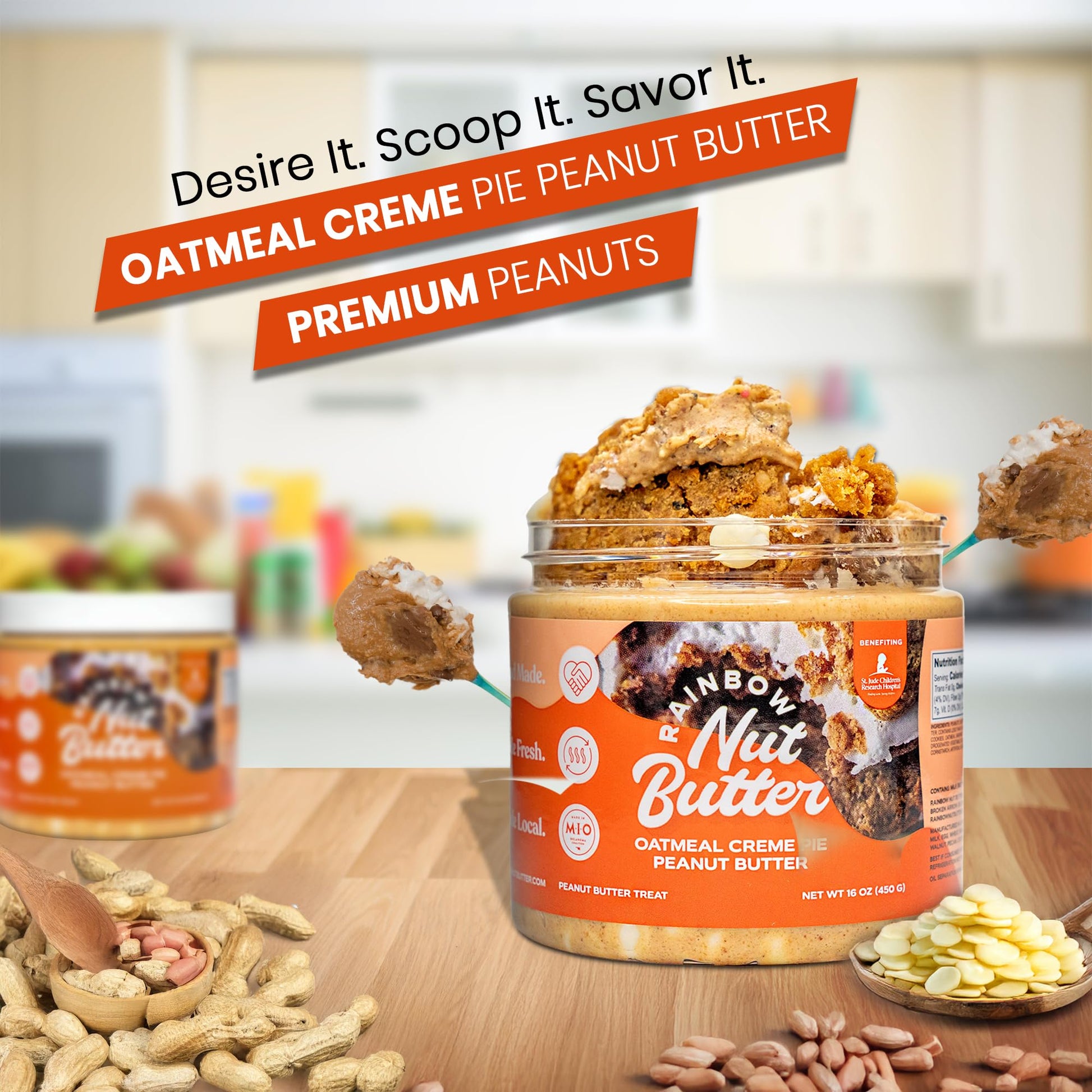 - Q: What makes Oatmeal Creme Pie Peanut Butter different from regular peanut butter? A: Unlike regular peanut butter, Oatmeal Creme Pie Peanut Butter features a unique blend of flavors and textures, combining the nostalgic taste of oatmeal cookies and sweet icing with the richness of peanut butter and white chocolate chips.