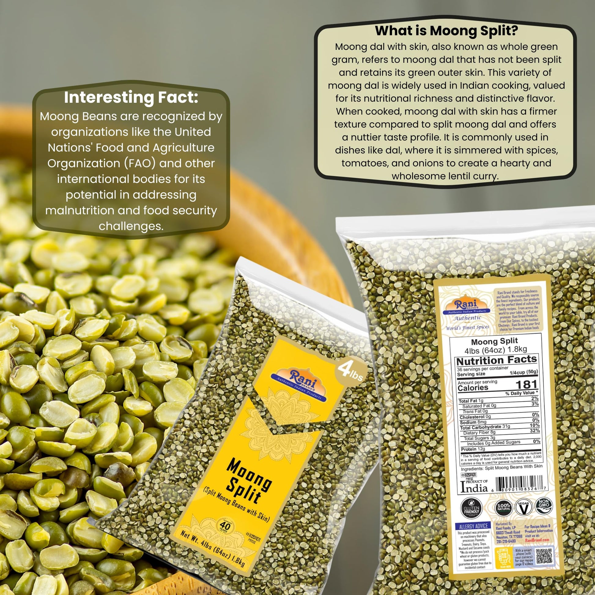Q: Where are Rani Moong Split Lentils sourced from?A: Rani Moong Split Lentils are of Indian origin, reflecting the traditional ingredients used in Indian cuisine and are offered by a USA-based company with over 40 years of experience in providing authentic Indian products.