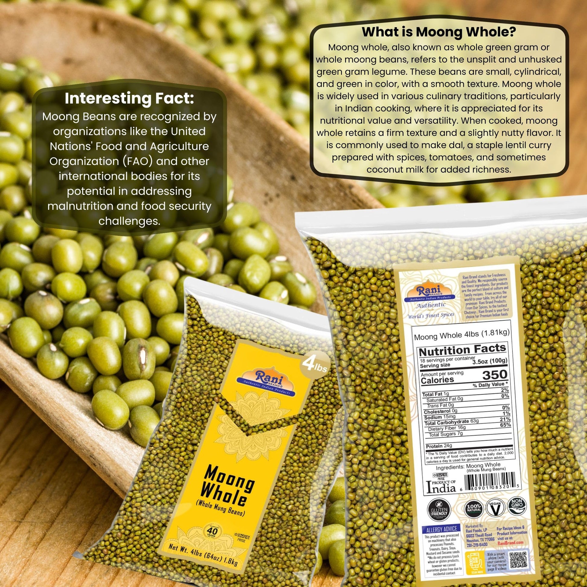 Q: How can I use Rani Moong Whole in my cooking?A: Rani Moong Whole lentils can be used in a variety of dishes. They are perfect for soups, salads, and curries, and can also be sprouted for added nutritional benefits. Easy recipes are often included on the packaging.