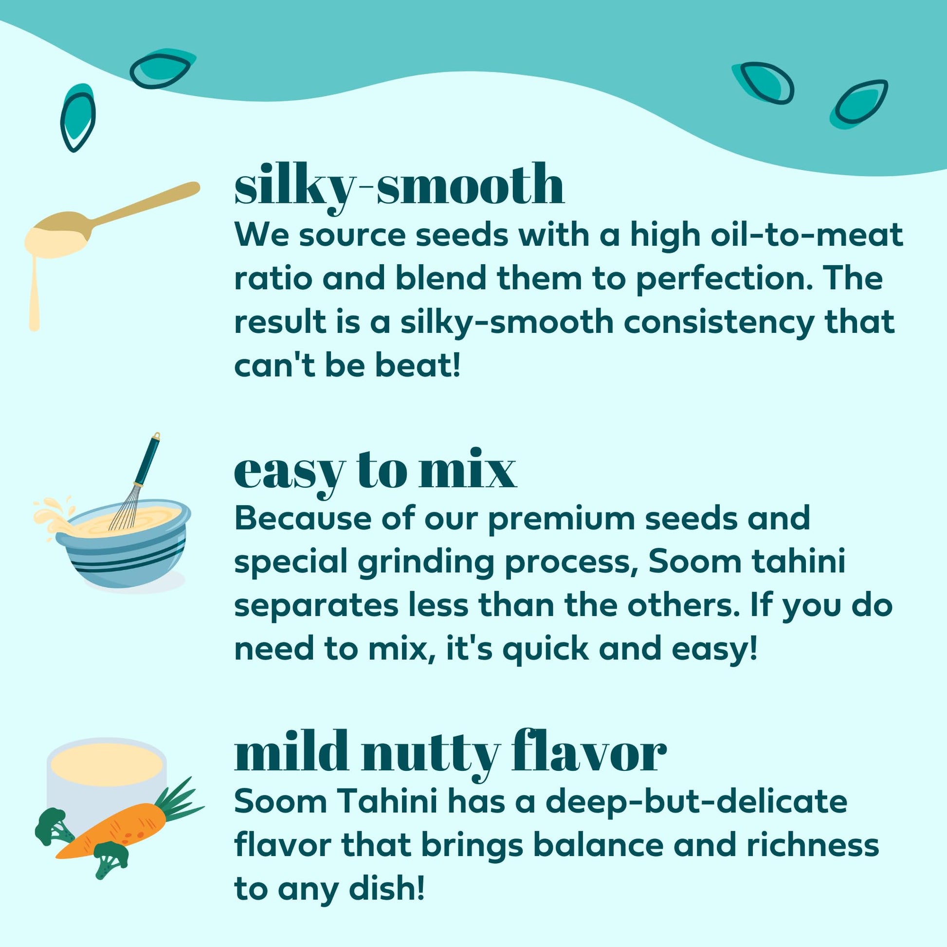 Q: What nutritional benefits does tahini provide?A: Soom Tahini is a nutrient-dense superfood packed with benefits including iron, calcium, and 6g of plant-based protein per serving, contributing to a healthy diet.