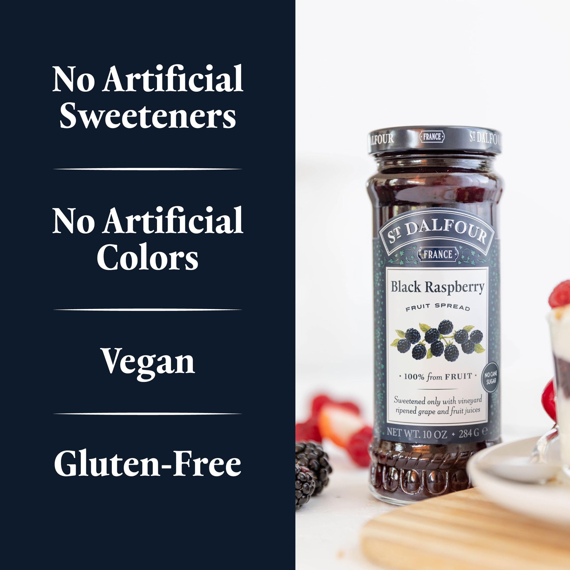 - Q: What makes St. Dalfour Black Raspberry Fruit Spread different from other fruit spreads? A: St. Dalfour Black Raspberry Fruit Spread is unique due to its premium quality, made with 100% fruit and sweetened solely with fruit juice concentrates. It contains no artificial additives, synthetic nitrates or nitrites, ensuring a wholesome and natural fruit experience.