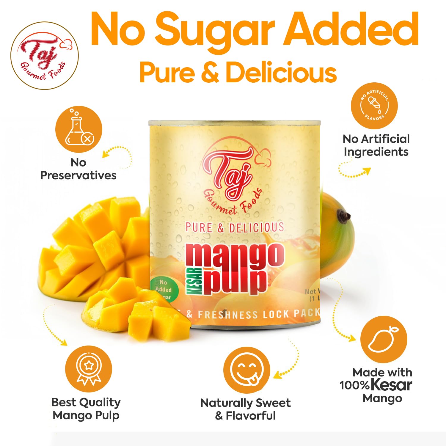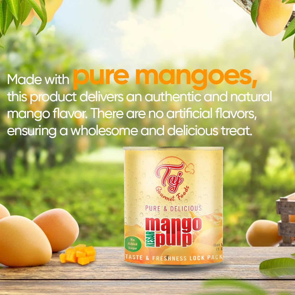 - Q: What makes TAJ Kesar Natural Mango Pulp different from other mango pulps? A: TAJ Kesar Natural Mango Pulp is made from 100% natural Kesar mangoes, renowned for their rich aroma and golden color. Unlike many other mango pulps, it contains no added sugar, allowing you to enjoy the authentic taste of ripe mangoes in its purest form.