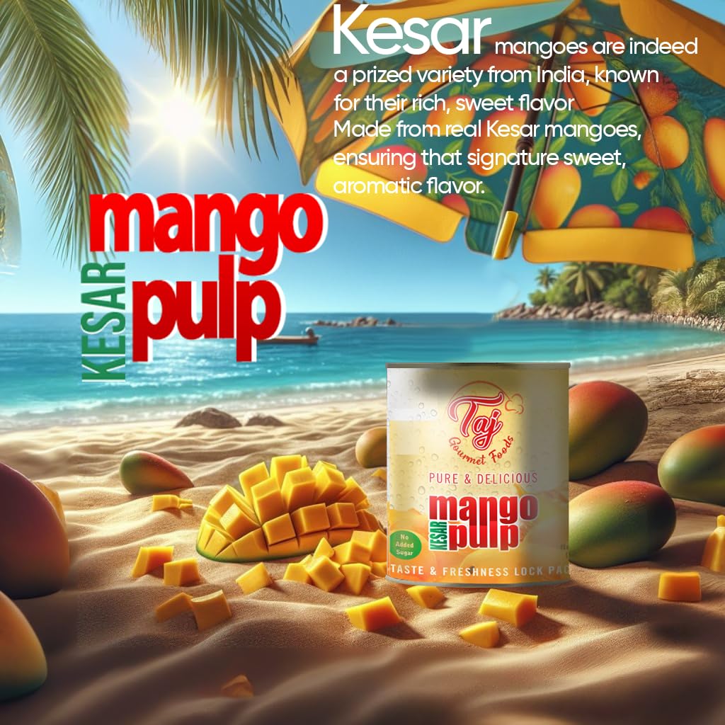 - Q: Can I use TAJ Kesar Mango Pulp for making smoothies? A: Absolutely! TAJ Kesar Mango Pulp is perfect for smoothies due to its rich, velvety texture and natural sweetness. Simply blend it with your favorite fruits, yogurt, or milk for a delicious and nutritious drink.